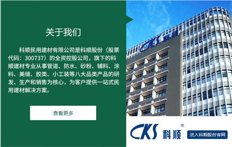 科顺民用建材有限公司是科顺股份(股票代码:300737)的全资控股公司,旗下的科顺建材专业从事管道、防水、砂粉、辅料、涂料、美缝、胶类、小工装等八大品类产品的研发、生产和销售为核心,为客户提供一站式民用建材解决方案。