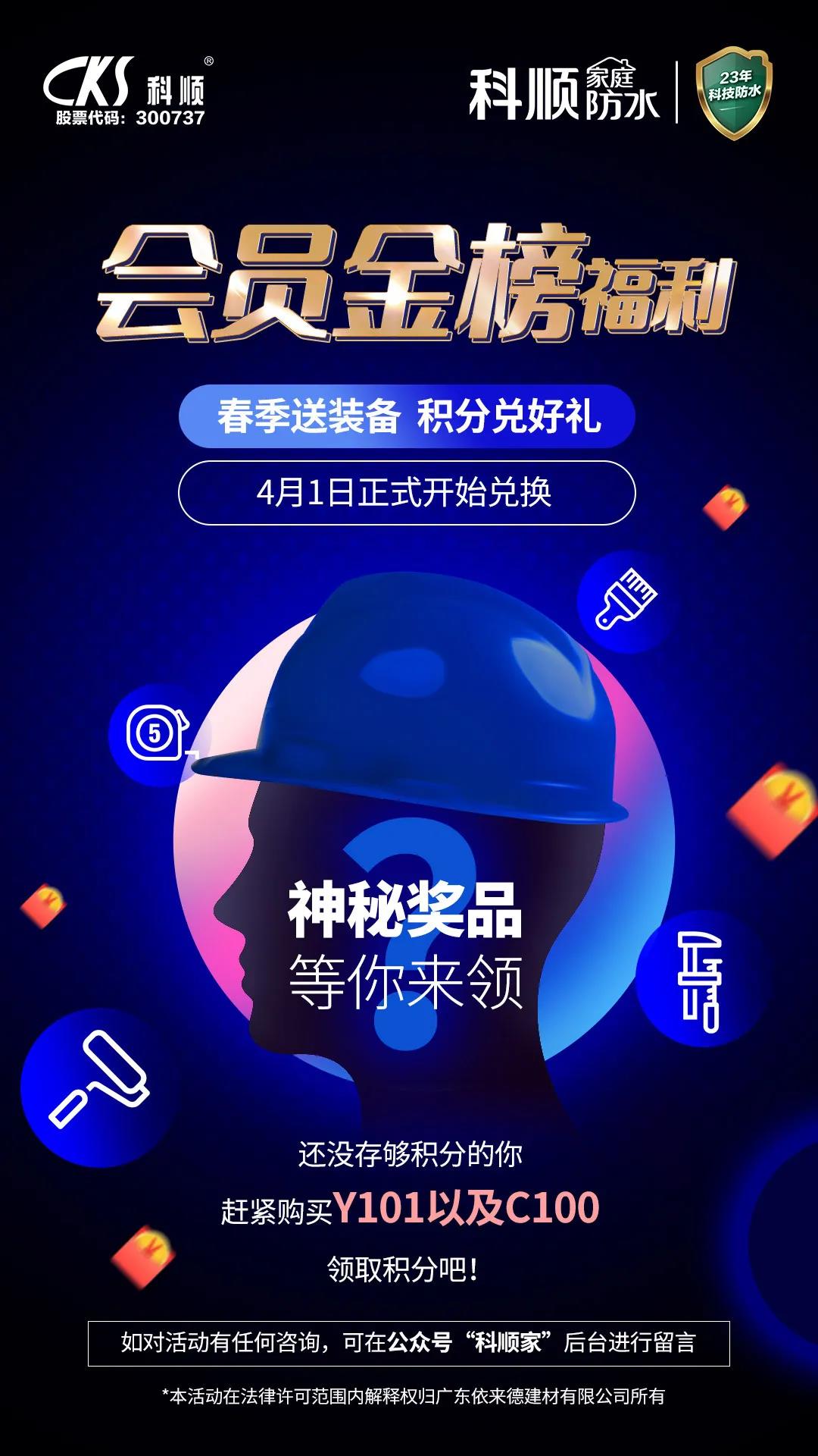 1、科顺家庭防水服务号“科顺家”将于每季度举办会员金榜福利活动,在每个季度最后一天,公布本季度金榜会员。每个季度累计会员积分排名前三的会员,即为季度金榜会员。