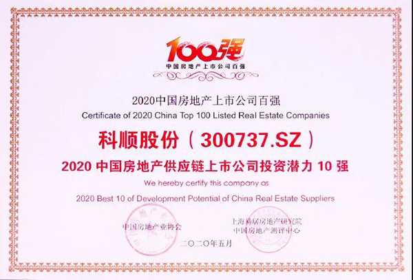 科顺股份凭借出色的企业实力荣获2020中国房地产供应链上市公司投资潜力10强荣誉。