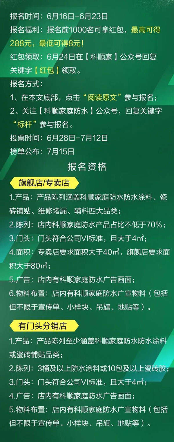科顺家庭防水的第一波年中庆重磅发力,联合线上线下举行“标杆上榜 拿大奖”活动。“五星标杆店”、“
