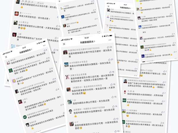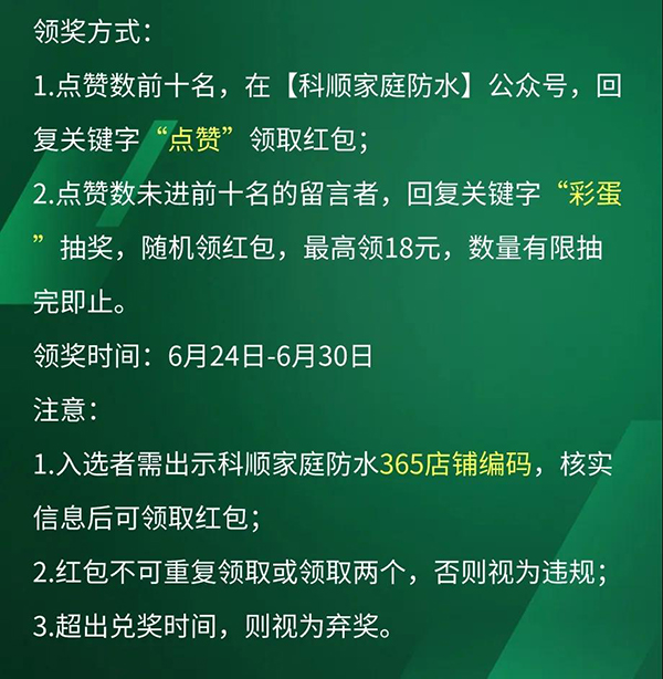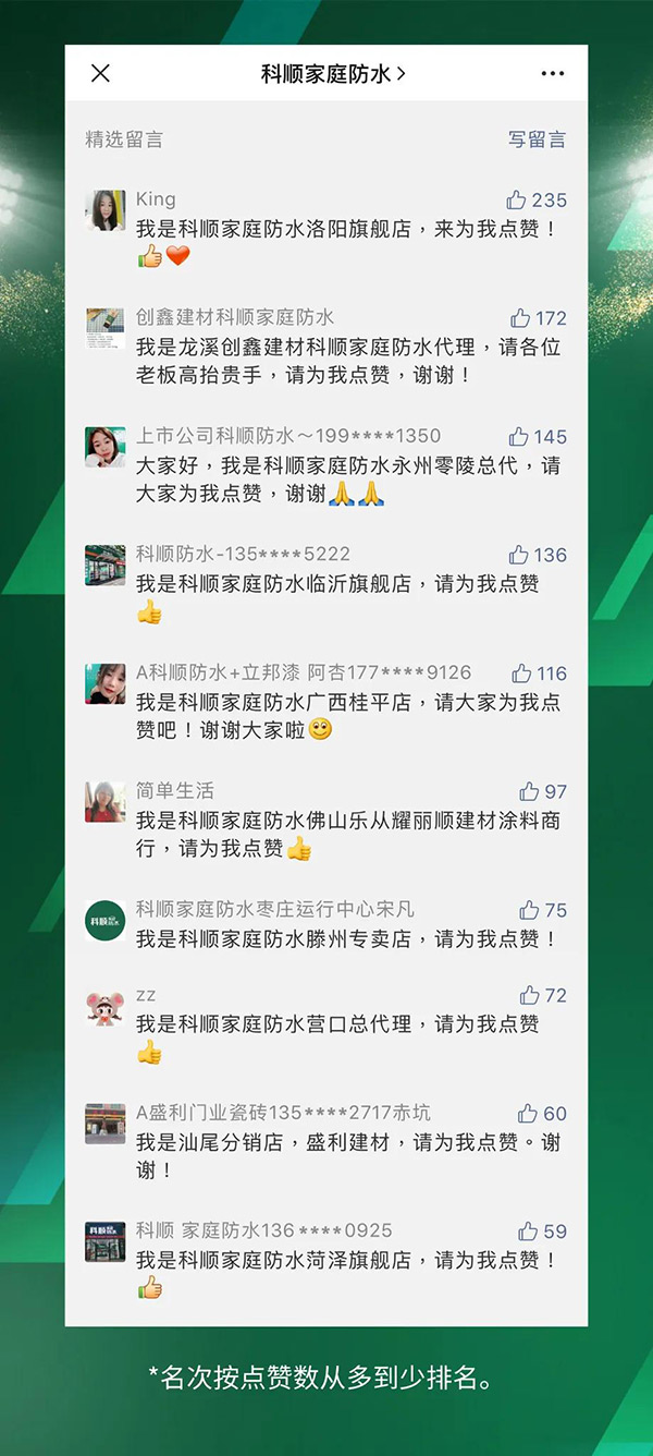 为科顺家庭防水全国门店点赞,各地积极留言,遍地开花。留言点赞红包已准备好,请看榜单!