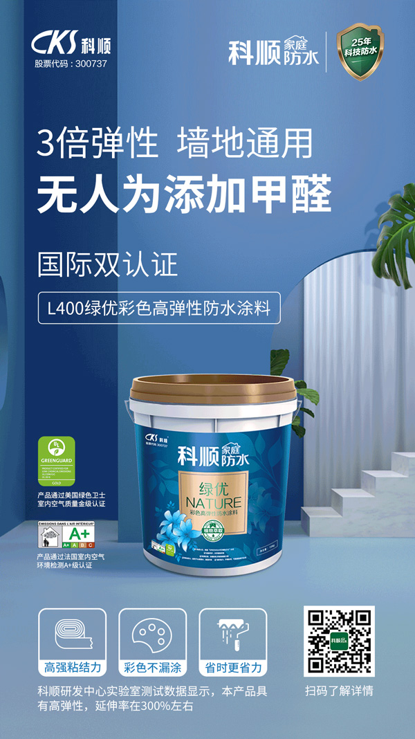 针对消费者需求,科顺家庭防水将25年科技防水经验沉淀和千万工程精湛防水技术应用至家庭防水中,创新研发出了绿优系列防水产品,以十倍于国家标准的严苛程度,通过了国际三大权威环保认证,将“专业”与“环保”带到千家万户。