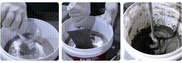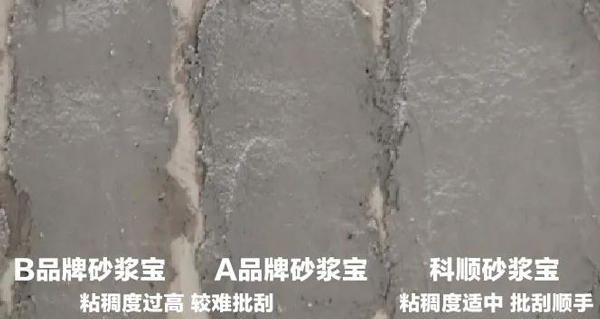 科顺砂浆宝与其他品牌砂浆宝分组按参考比例搅拌混合,对比混合后砂浆的粘稠性跟批刮性。
