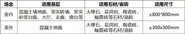 适用于大理石、花岗岩等天然石材,也适用于陶瓷砖、釉面砖等瓷砖;室内外/墙地面通用。