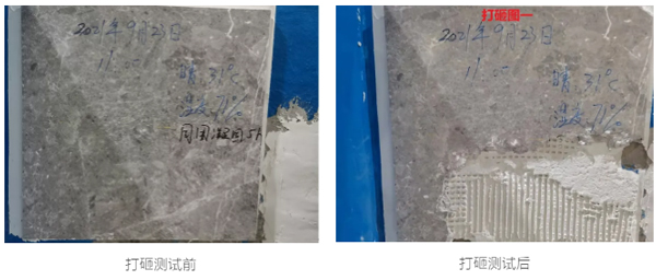 养护7天后使用铁锤打砸大理石瓷砖底部,底部瓷砖碎裂掉落,瓷砖胶层与基面依然粘贴牢固。