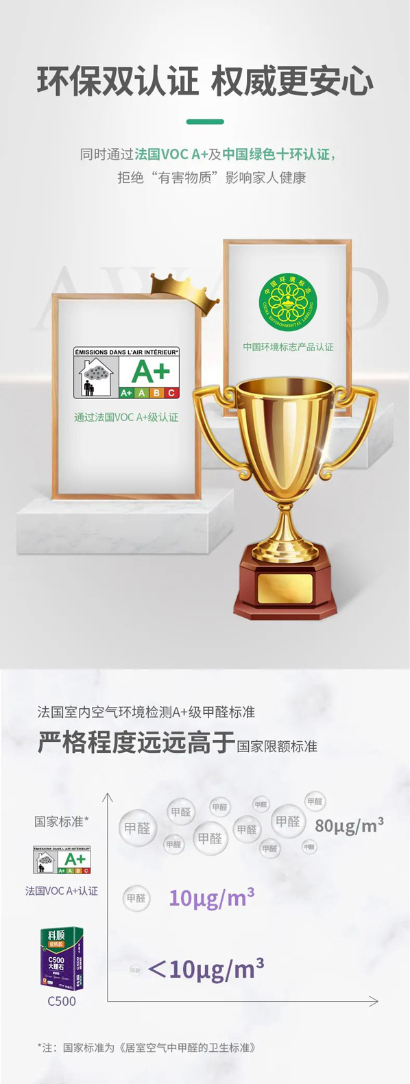 C500大理石瓷砖胶获得中国十环、法国A+国际环保双认证,产品环保可靠。