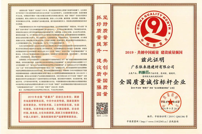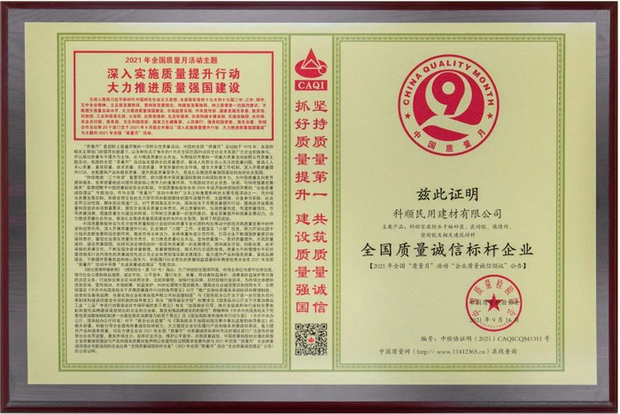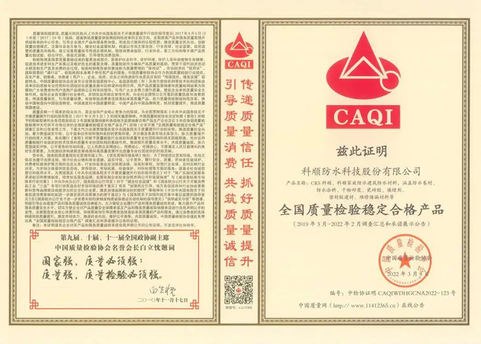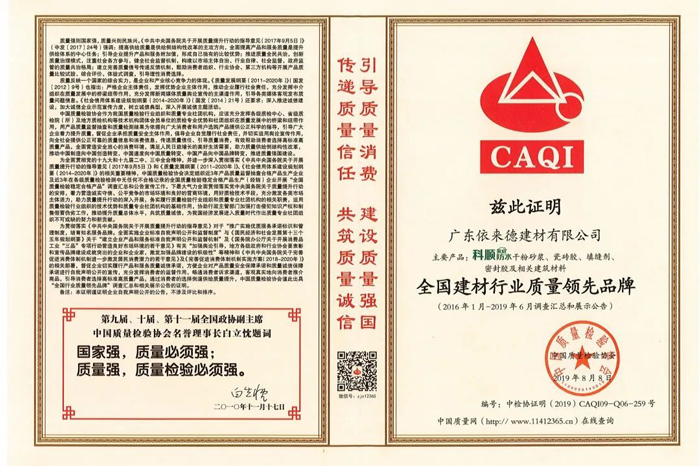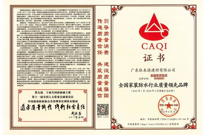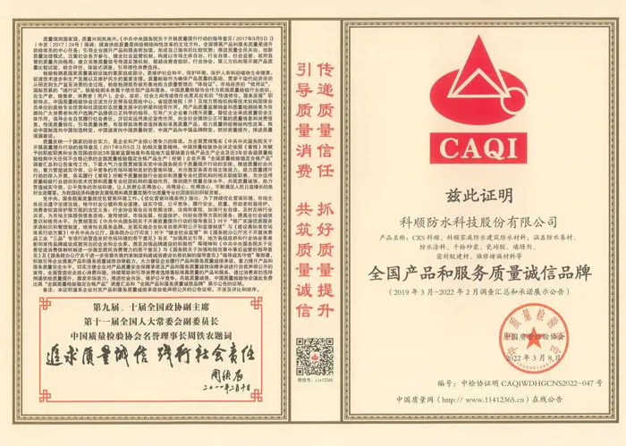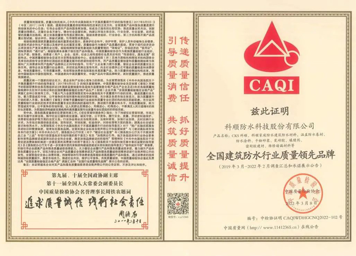 连续五年荣膺权威质量认证,不仅充分体现了科顺家庭防水过硬的产品质量,也体现了国家和广大消费者对科顺家庭防水品牌的认可。