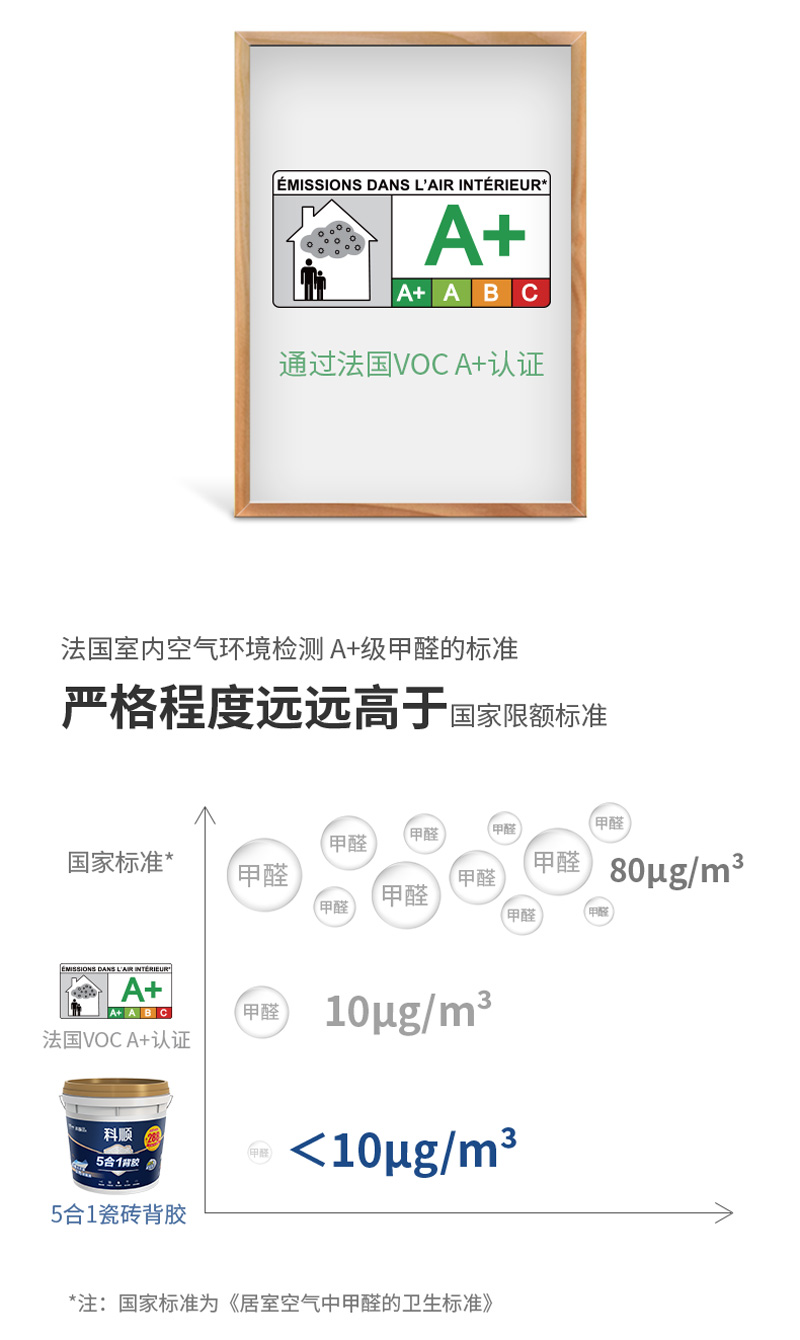 5合1瓷砖背胶通过法国VOC A+认证,10倍严苛于国家标准,清味环保。