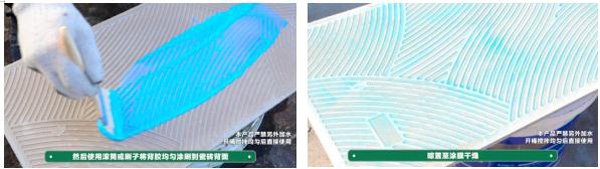 2.产品开桶搅拌均匀,用滚筒或刷子将背胶均匀涂刷到瓷砖背面并晾至干燥蓝色透明状态;