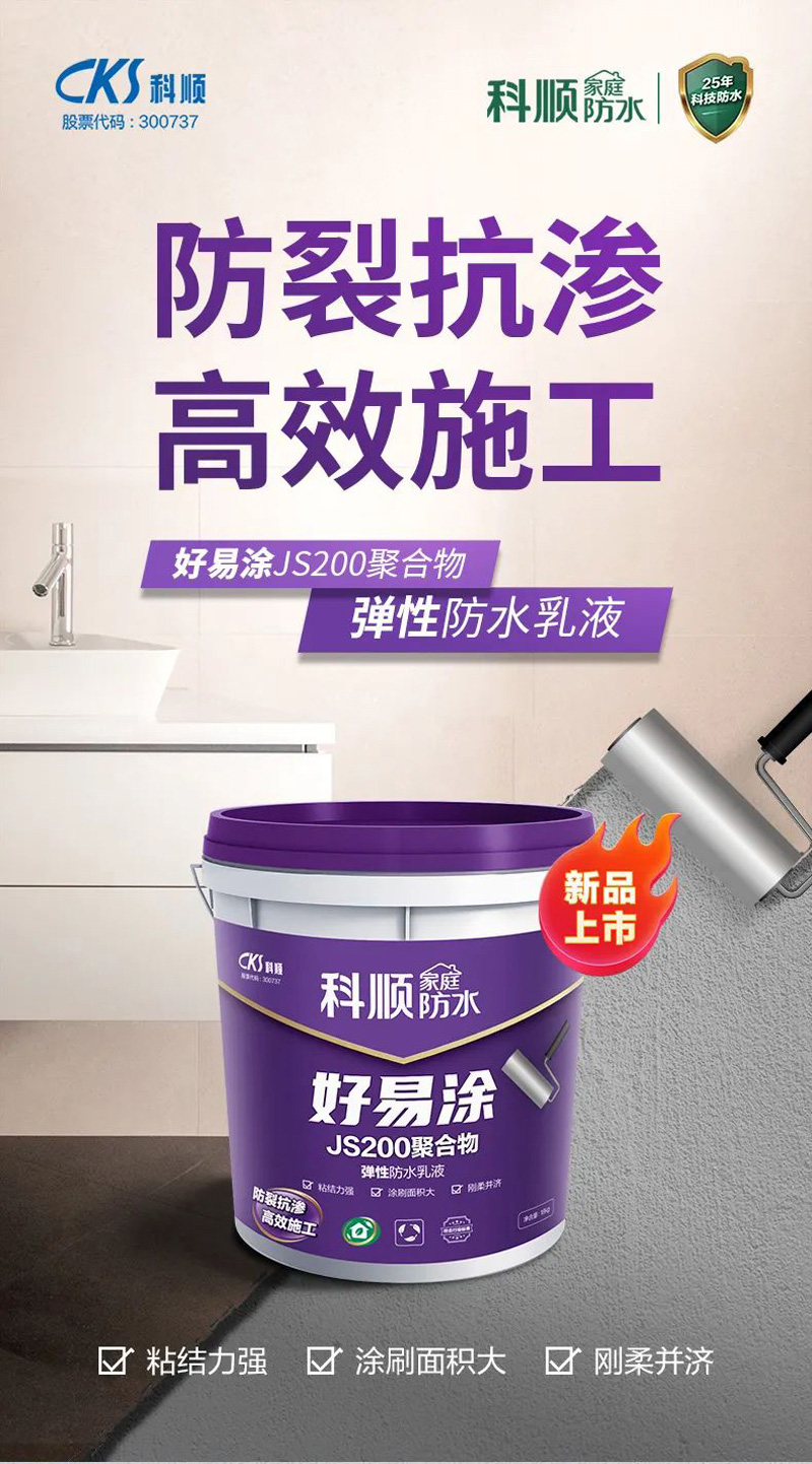 科顺好易涂JS200聚合物弹性防水乳液采用防流挂配方,粘结力强,基面附着性好。