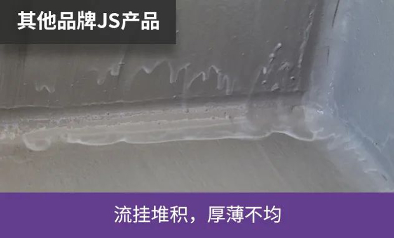 部分JS防水因粘稠度不足、基面附着力差,施工时容易出现流挂、堆积等现象。流挂堆积不仅使防水层厚度不足,影响防水性能,还容易导致成膜质量不稳,甚至会引发掉砖的风险。