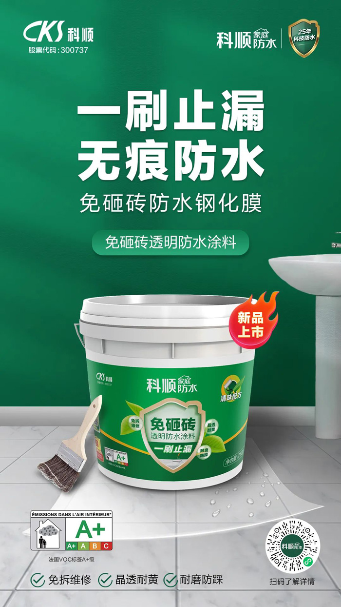 科顺家庭防水免砸砖透明防水涂料可直接涂刷成膜,有效阻隔水分渗透,一刷止漏,免拆维修。
