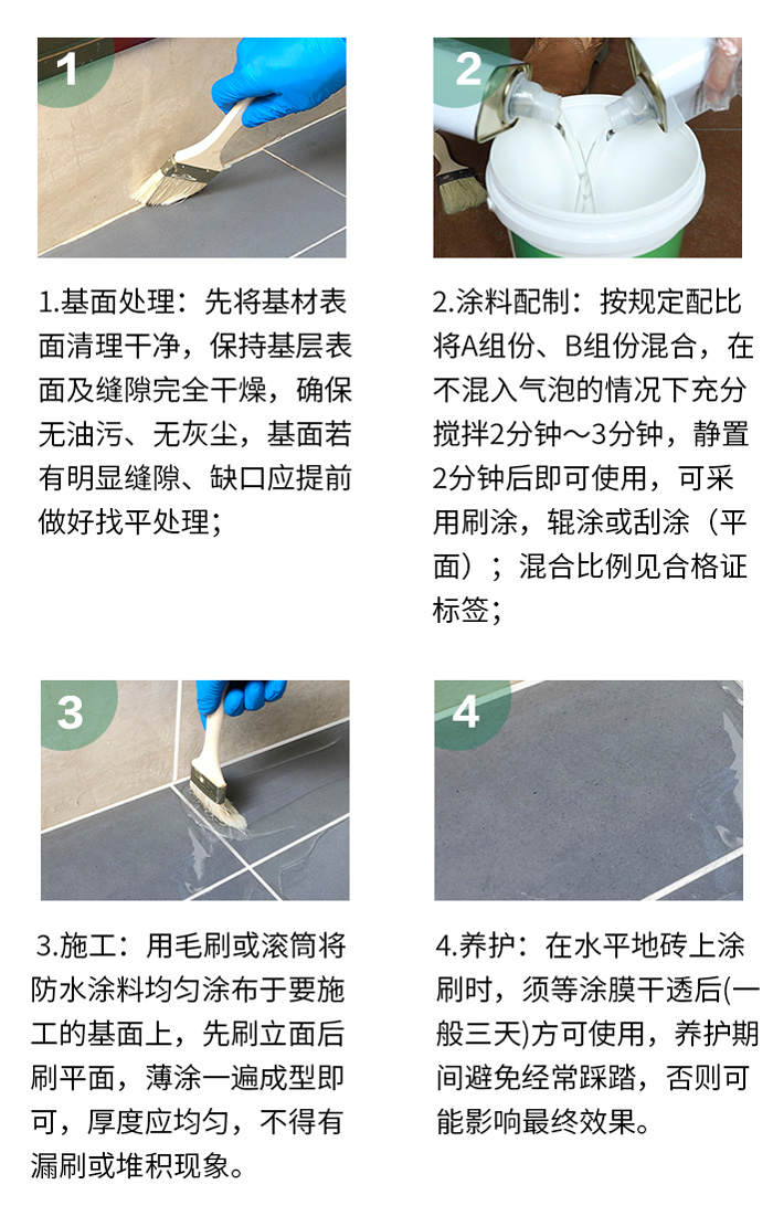 产品配比:A组分:B组分=2:1参考用量:0.2kg/㎡~0.5kg/㎡