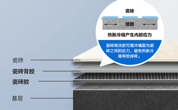 多功能背胶粘结强度高于C1标准的3倍*,可缓冲墙面与瓷砖之间的应力,避免热胀冷缩导致的瓷砖