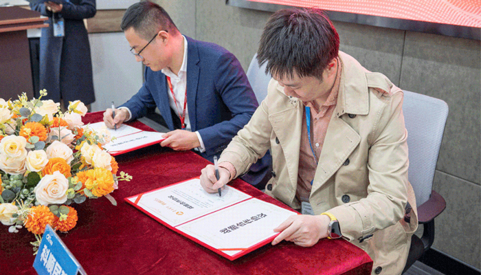 壹品装饰佛山总经理张志强和科顺民建集团总裁徐汝意签署战略合作协议,双方将基于协议展开全方位的