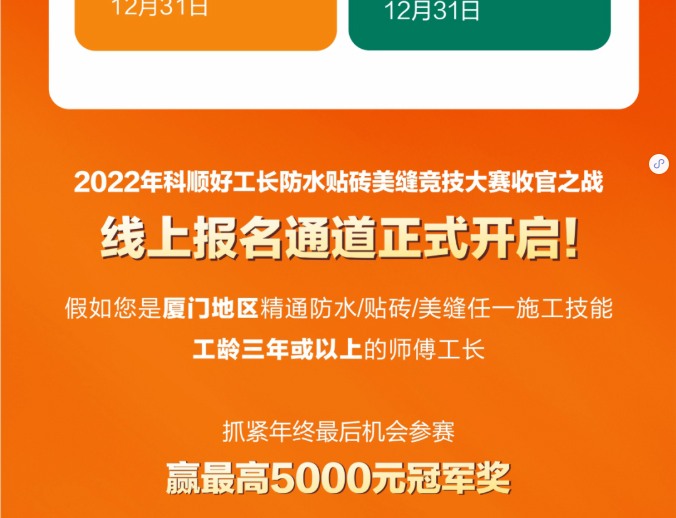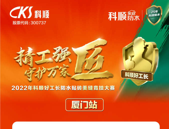 【参赛有奖】科顺好工长防水贴砖美缝竞技大赛(厦门站)报名正式开启!