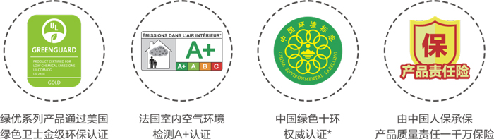 绿优系列产品通过美国绿色卫士最高金级认证,所有产品均通过了法国VOC检测的最高A+级认证并由中国