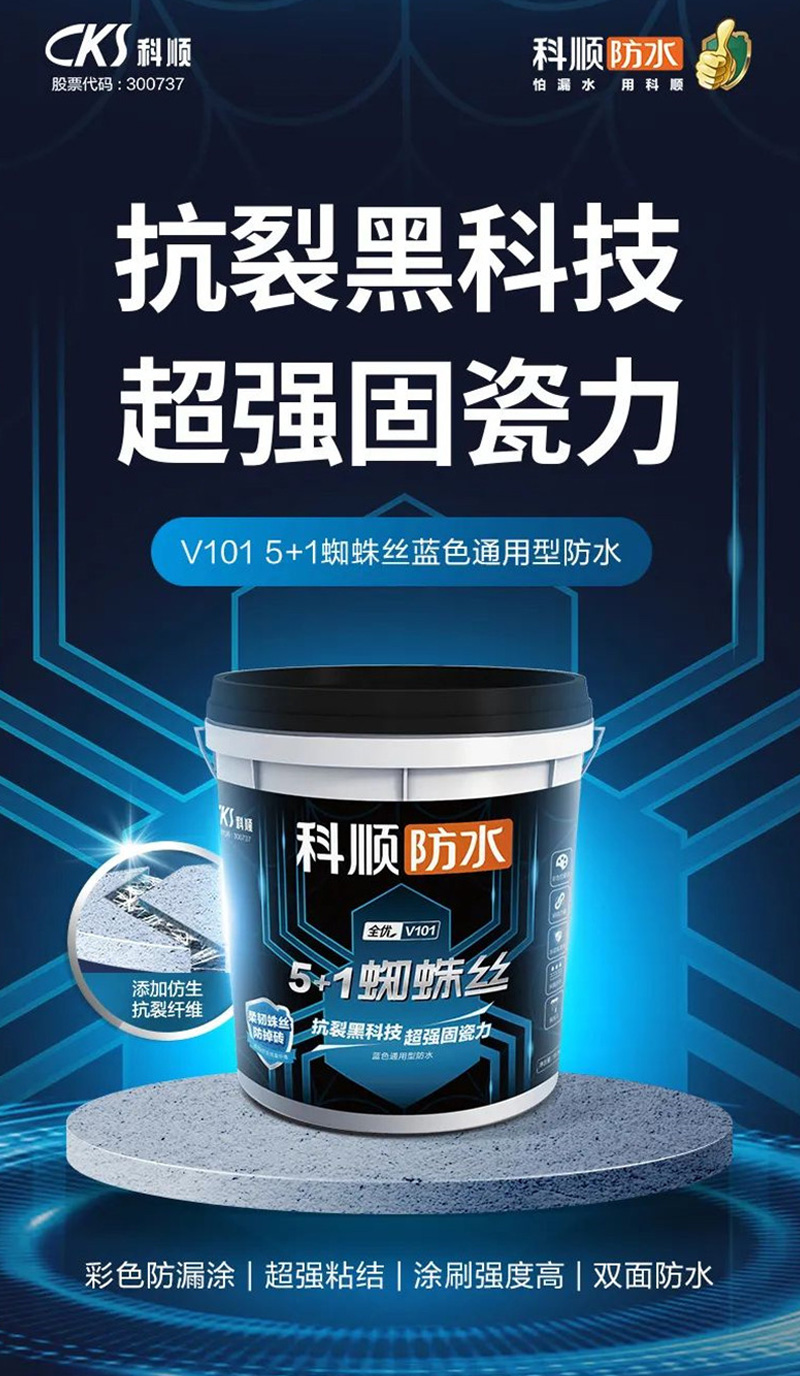 科顺V101 5+1蓝色强韧蜘蛛丝防水涂料,具备超强粘接力、颜色鲜艳防漏涂、省时高效易施工等特点。适用于建筑外墙、内墙整体的防水防渗处理或厨房、卫生间、楼地面以及水池等部位的防水防潮防渗处理。