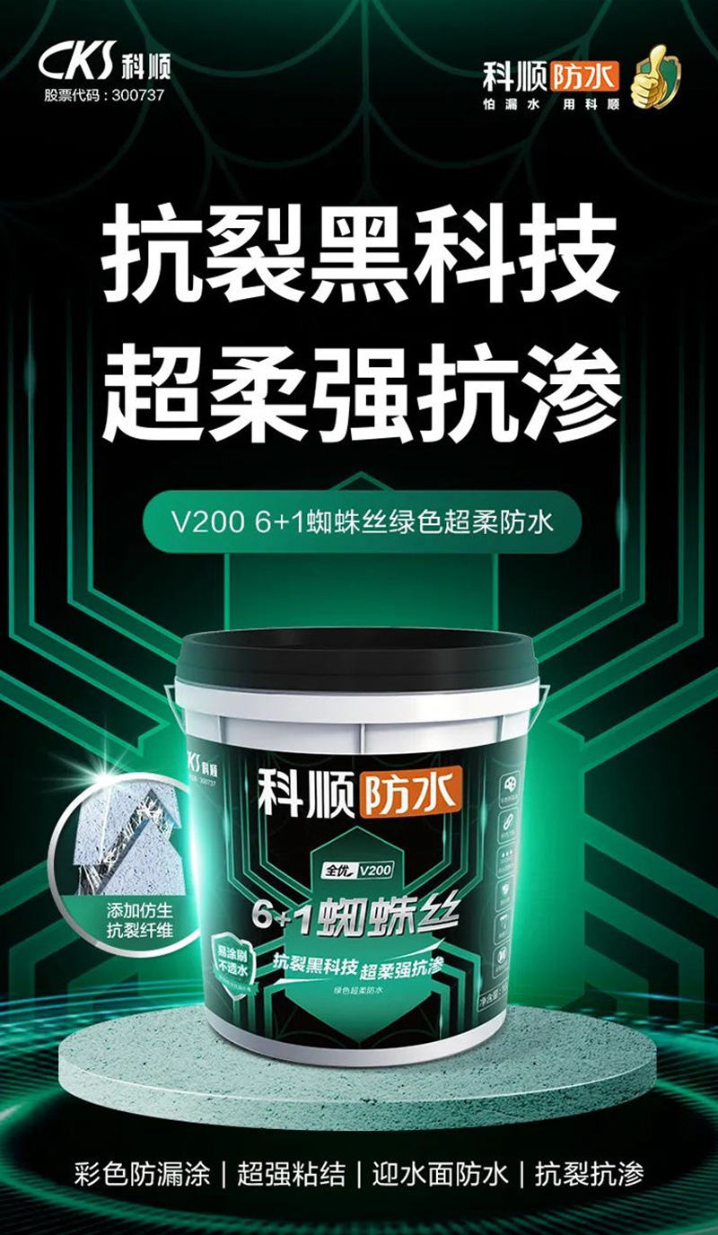 科顺V200 6+1绿色超柔蜘蛛丝防水涂料,纤维内聚力增强,涂膜柔韧性好,形成连续致密的防水涂膜,防水性能好。适用于厨卫间、水池、游泳池或室内整体防水防渗。