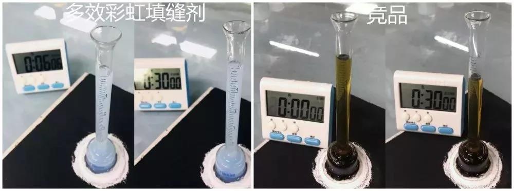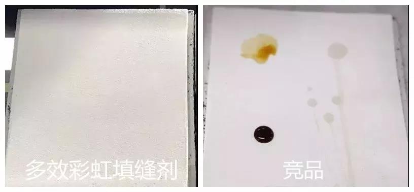通过这两种对比发现,竞品的水位线有明显的下降且疏水性差,被水和调料渗透污染;而彩虹多效填缝剂水位线和样块颜色则无变化,由此可见其憎水力强且疏水性能好,防水效果优异,具有自清洁能力。