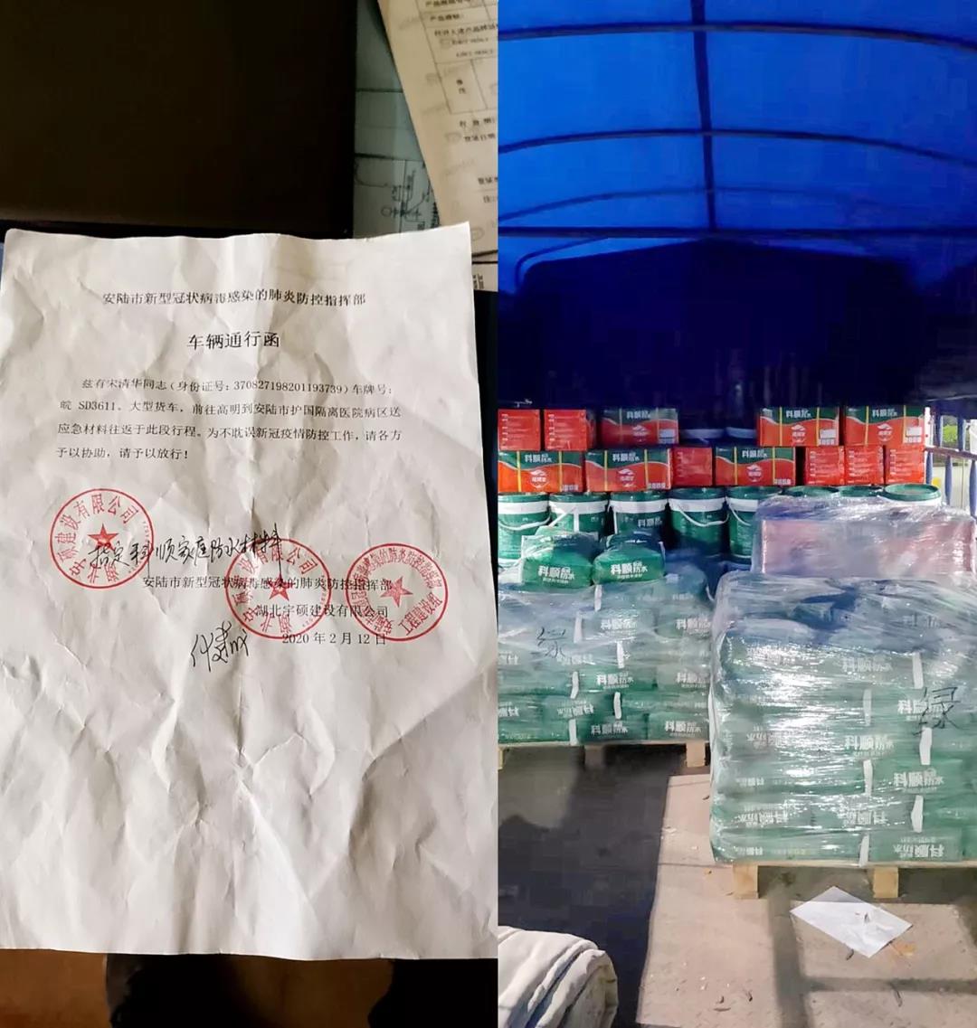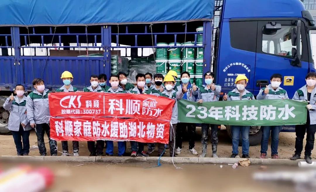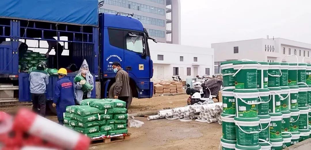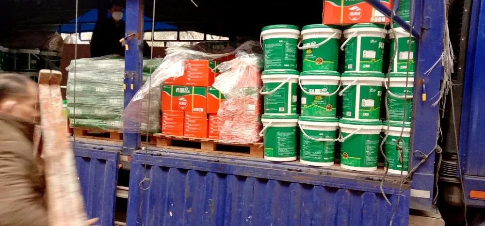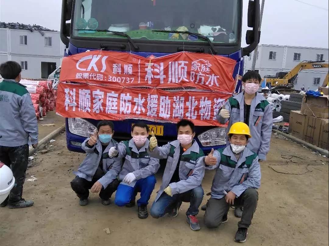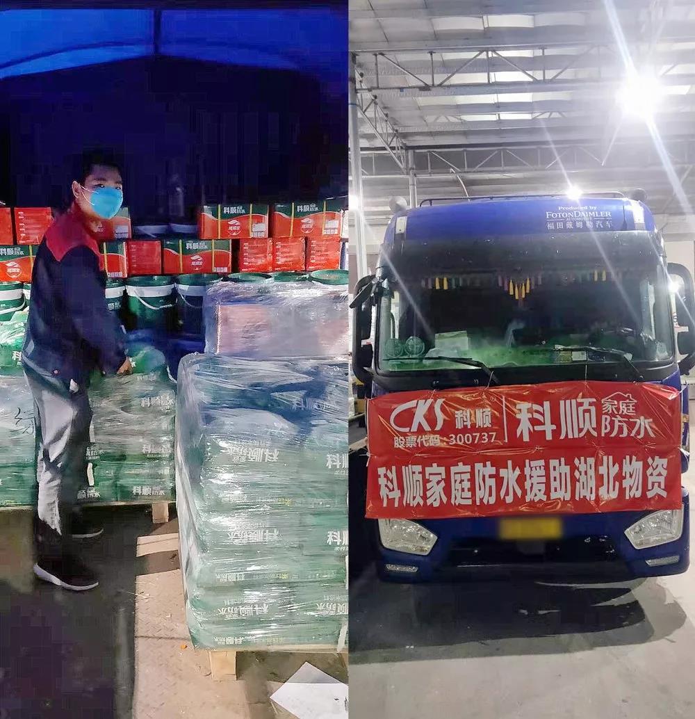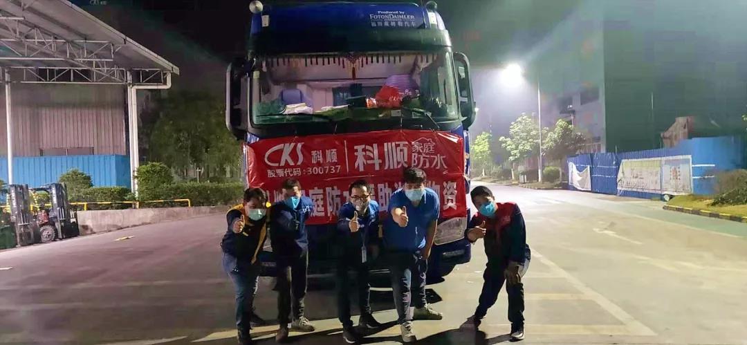 2月12日晚,位于佛山高明(科顺十大生产研发基地之一),满载物资的货车挂着横幅缓缓驶出大门,目的地在一千多公里外的湖北省安陆市。