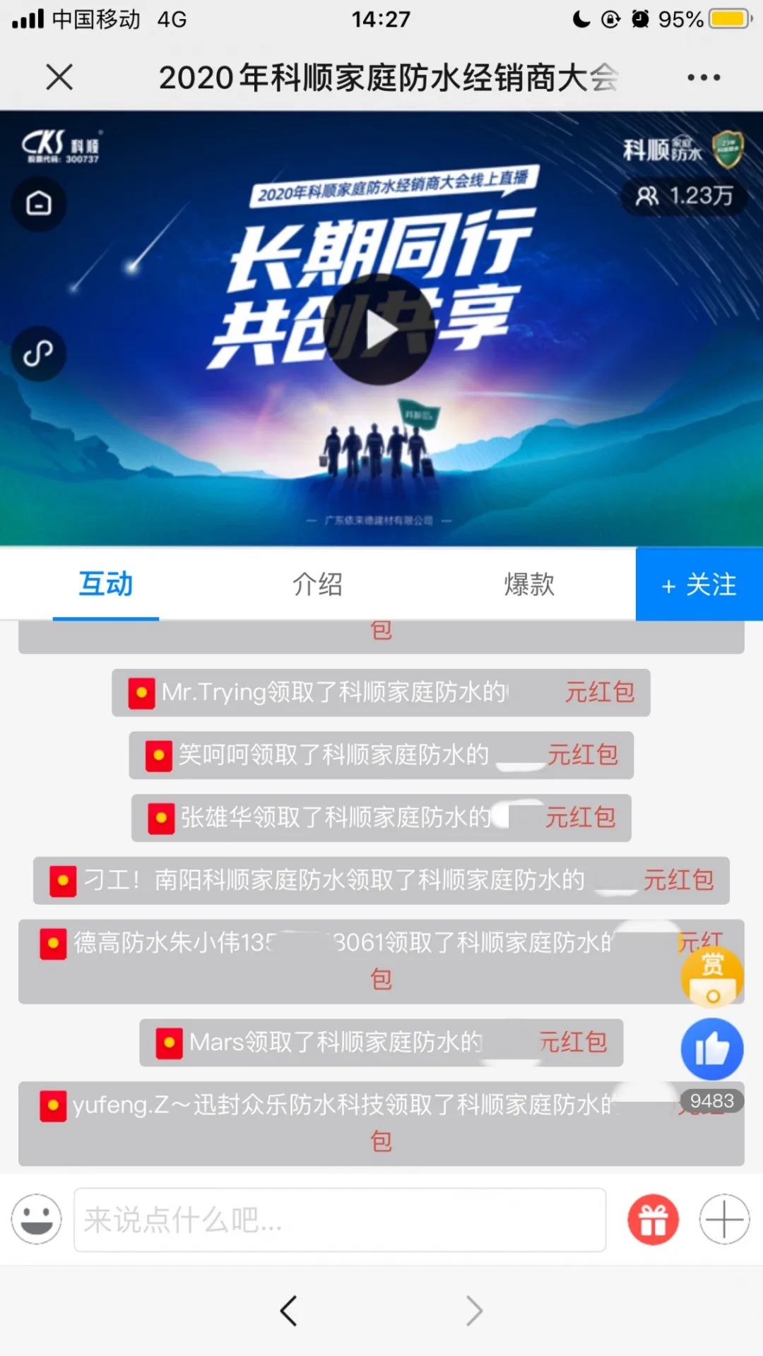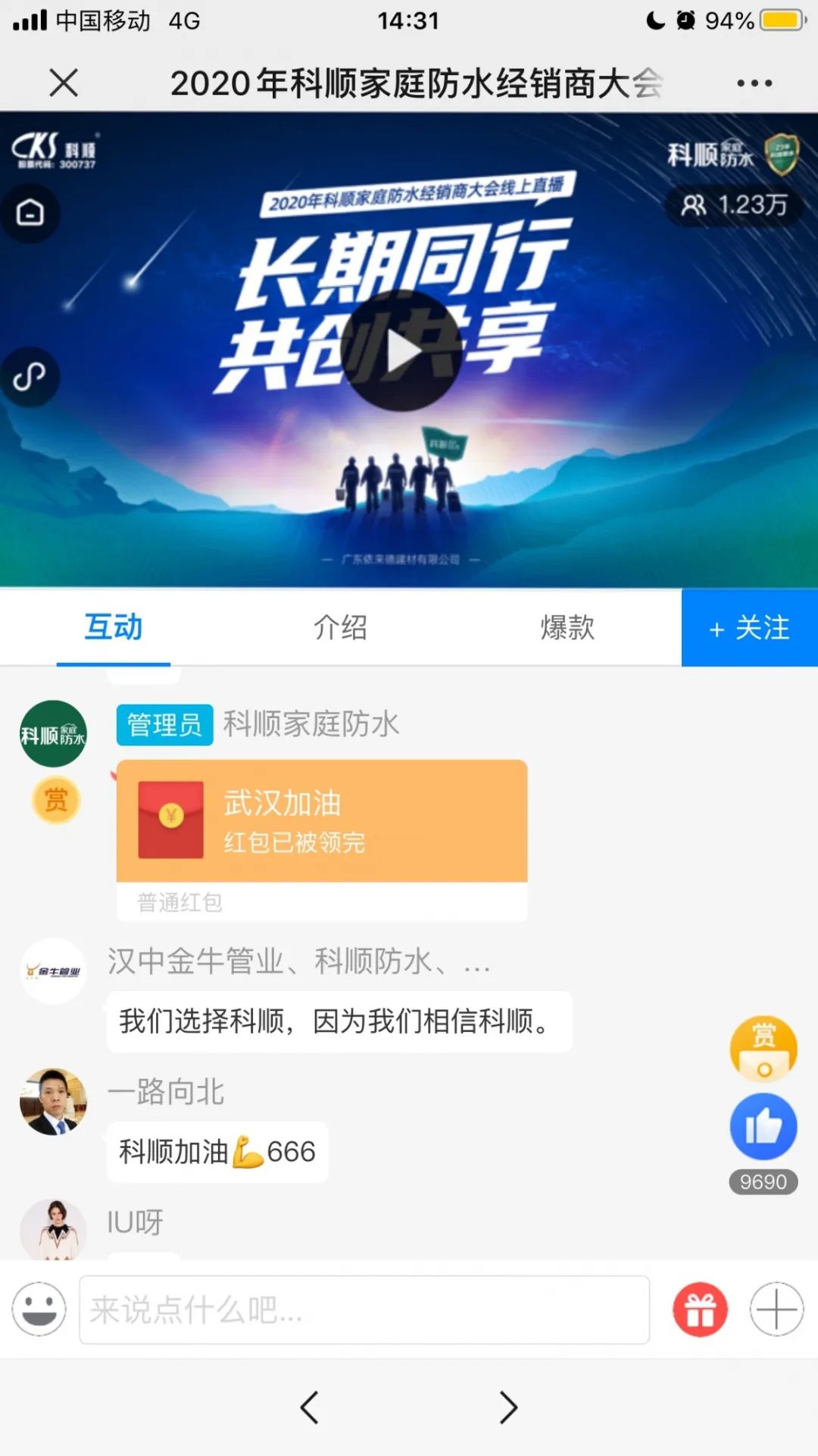 随着一波又一波的“红包雨”刷屏,2020年科顺家庭防水经销商大会线上直播圆满结束。未来,科顺家庭防水承诺持续高效投入,为合作伙伴们提供更大支持与服务。