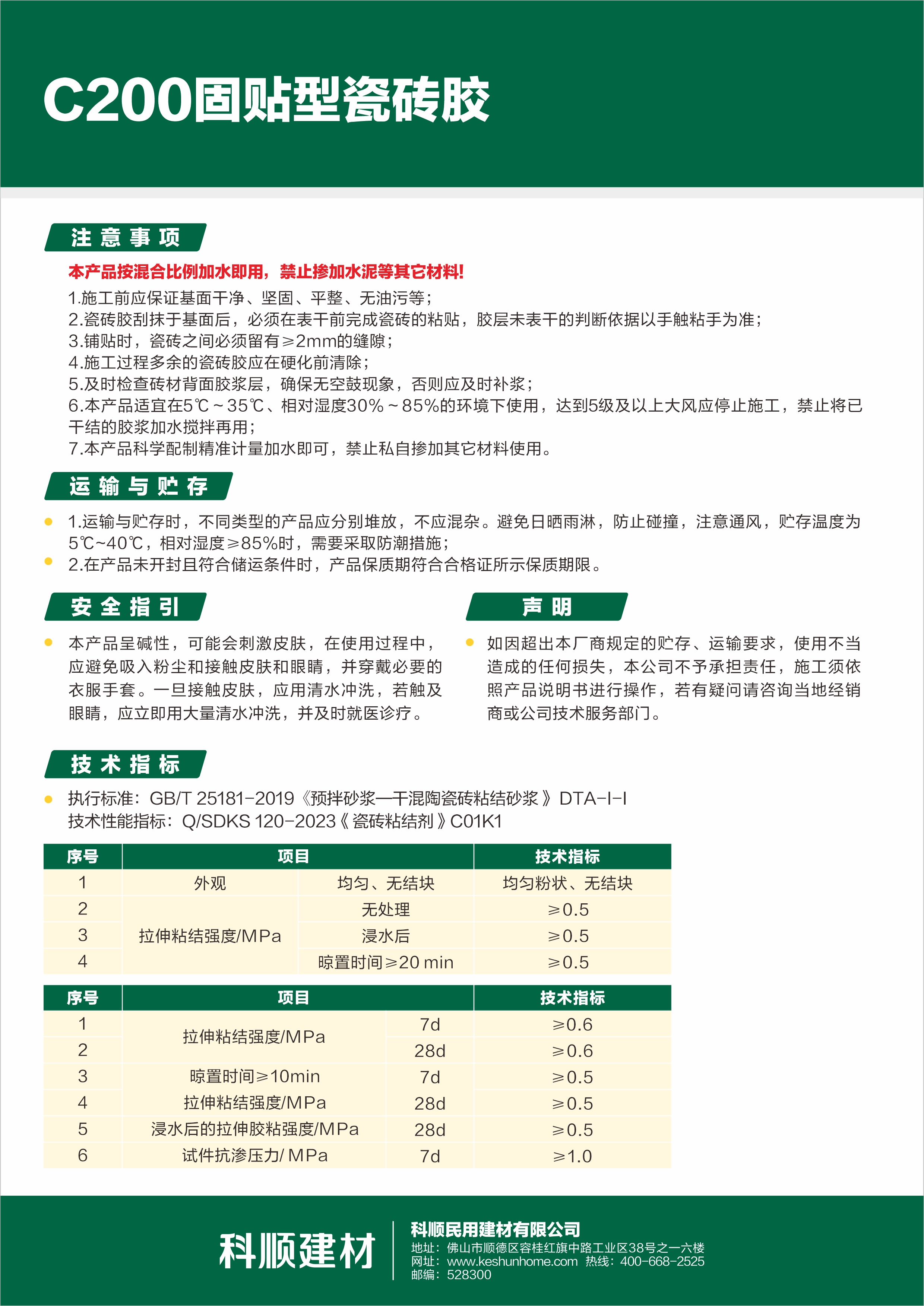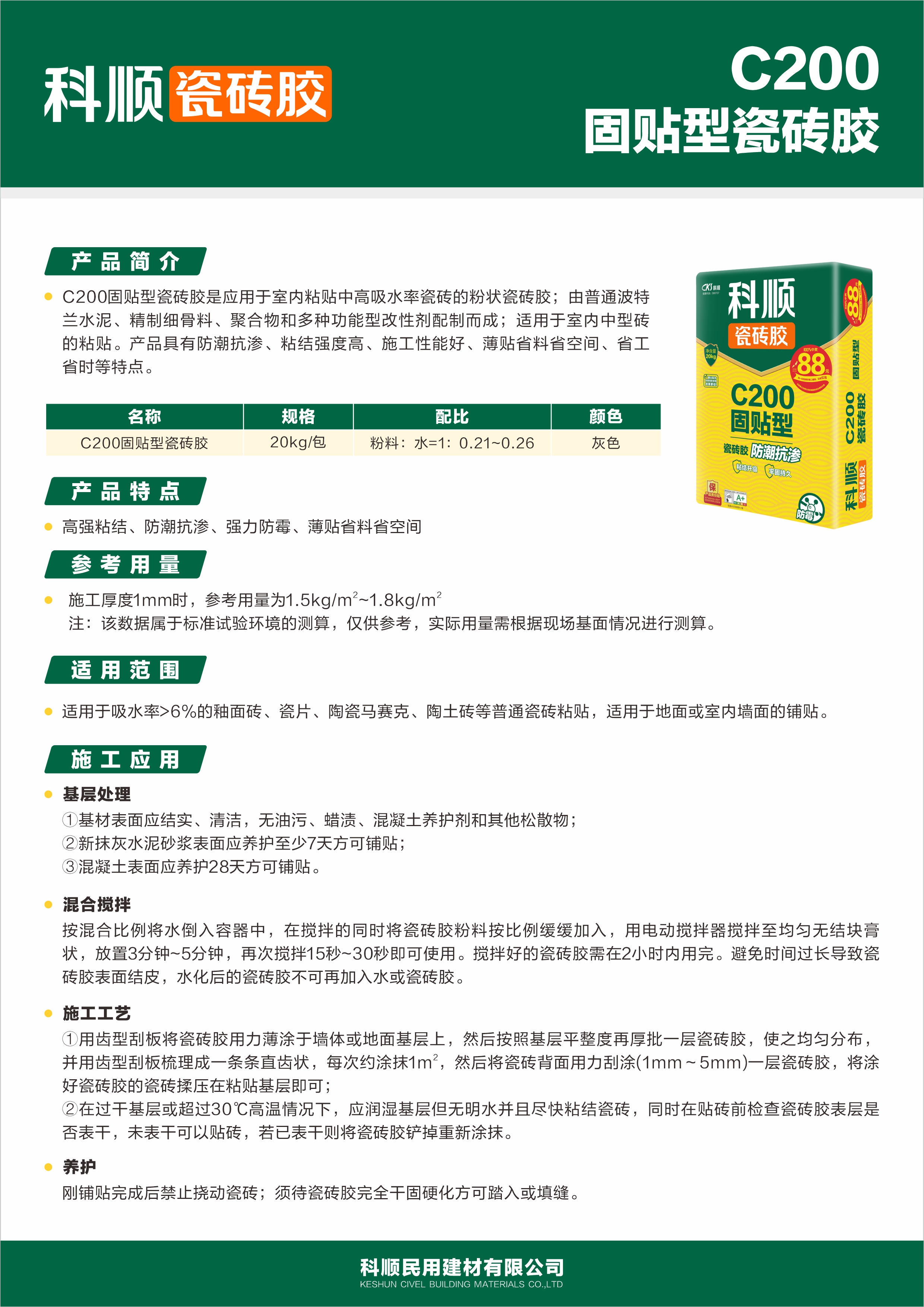 C200固贴型瓷砖胶是应用于室内粘贴中高吸水率瓷砖的粉状瓷砖胶;由普通波特兰水泥、精制细骨料、聚合物和多种功能型改性剂配制而成;适用于室内中型砖的粘贴。产品具有防潮抗渗、粘结强度高、施工性能好、薄贴省料省空间、省工省时等特点。
