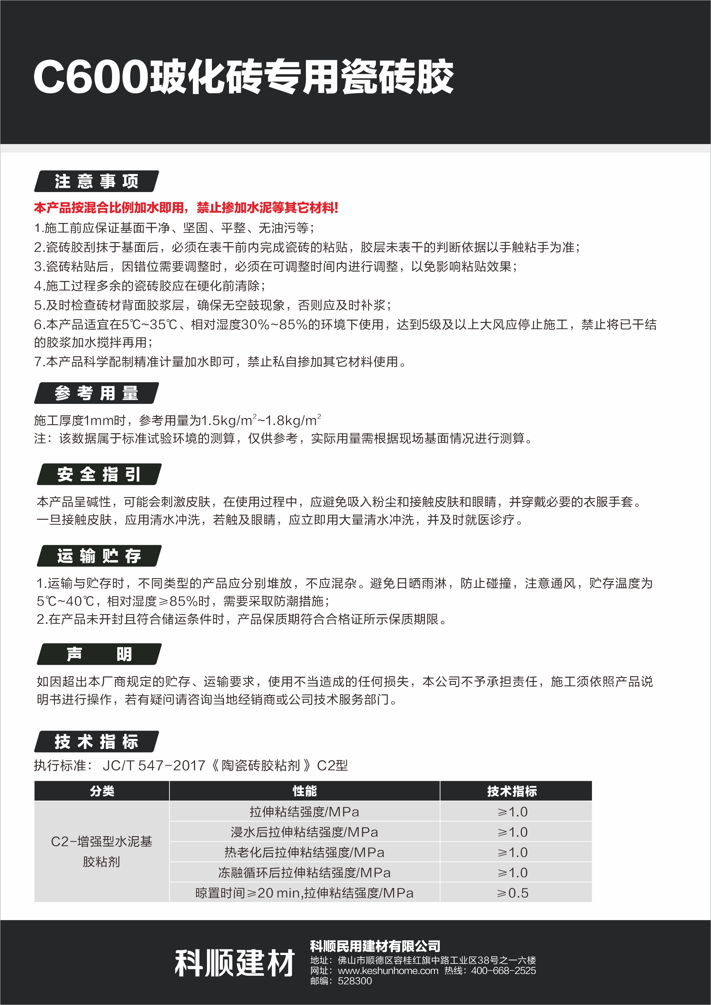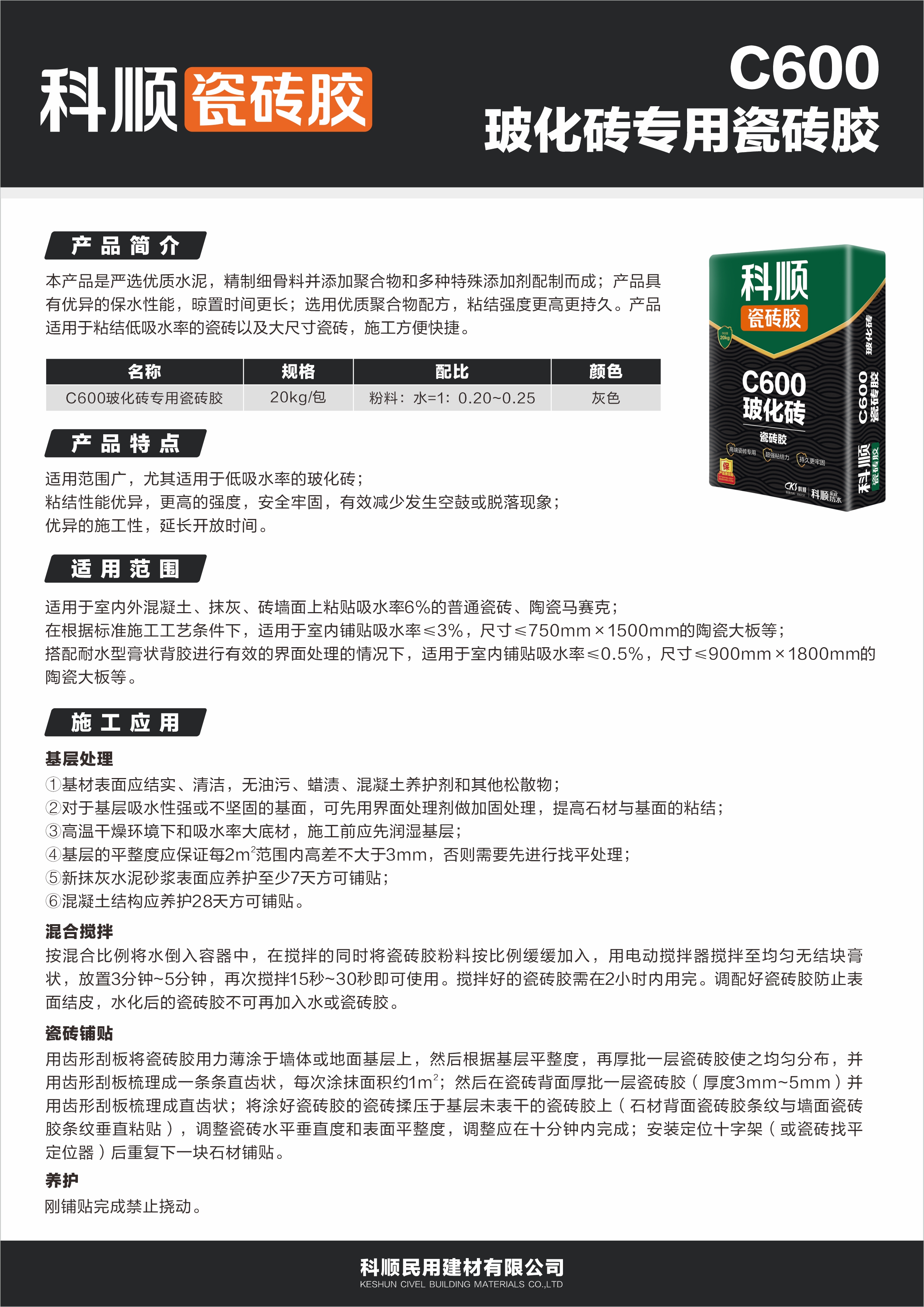 本产品是严选优质水泥,精制细骨料并添加聚合物和多种特殊添加剂配制而成;产品具有优异的保水性能,晾置时间更长,选用优质聚合物配方,粘结强度更高更持久。产品适用于粘结低吸水率的瓷砖以及大尺寸瓷砖,施工方便快捷。