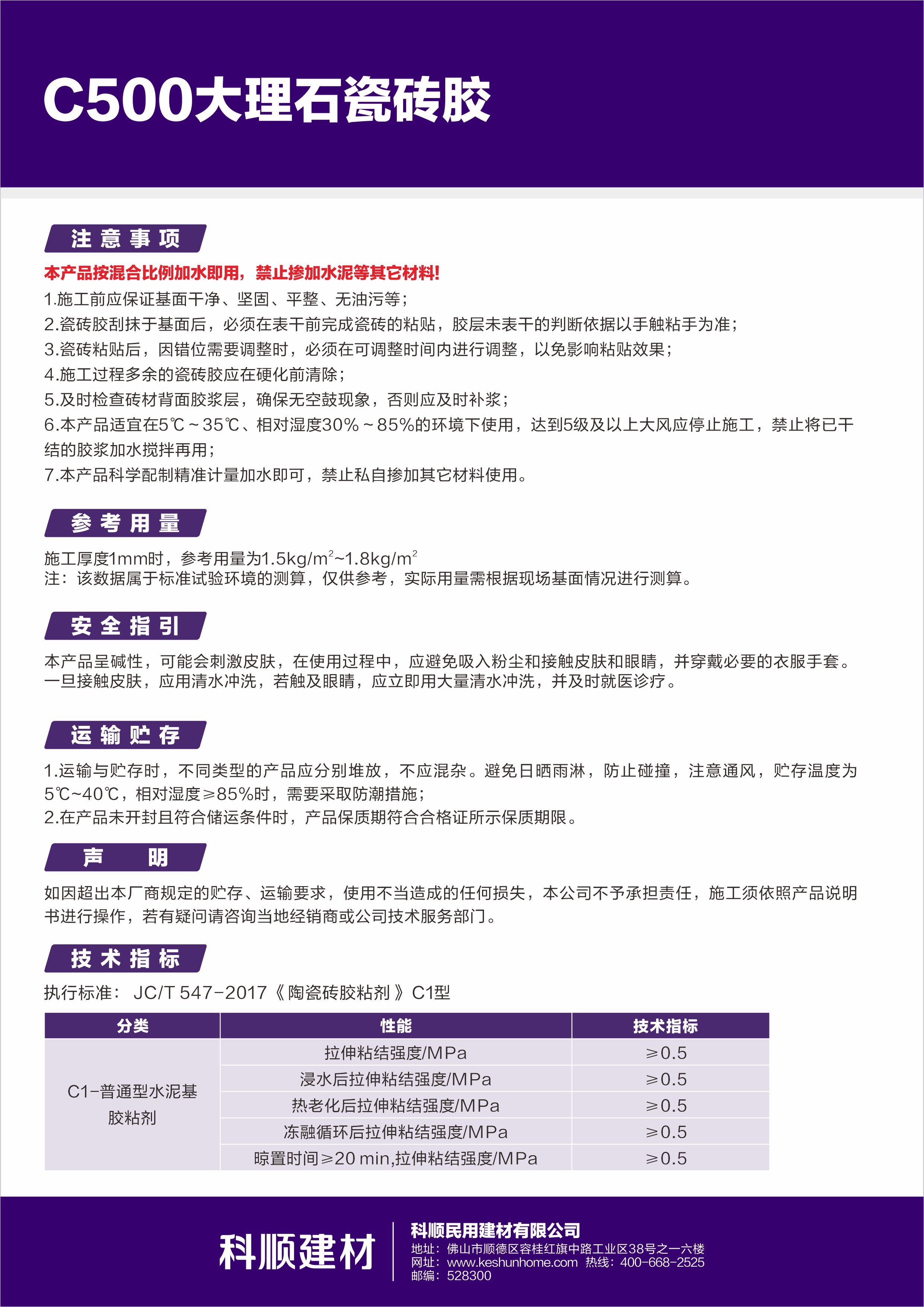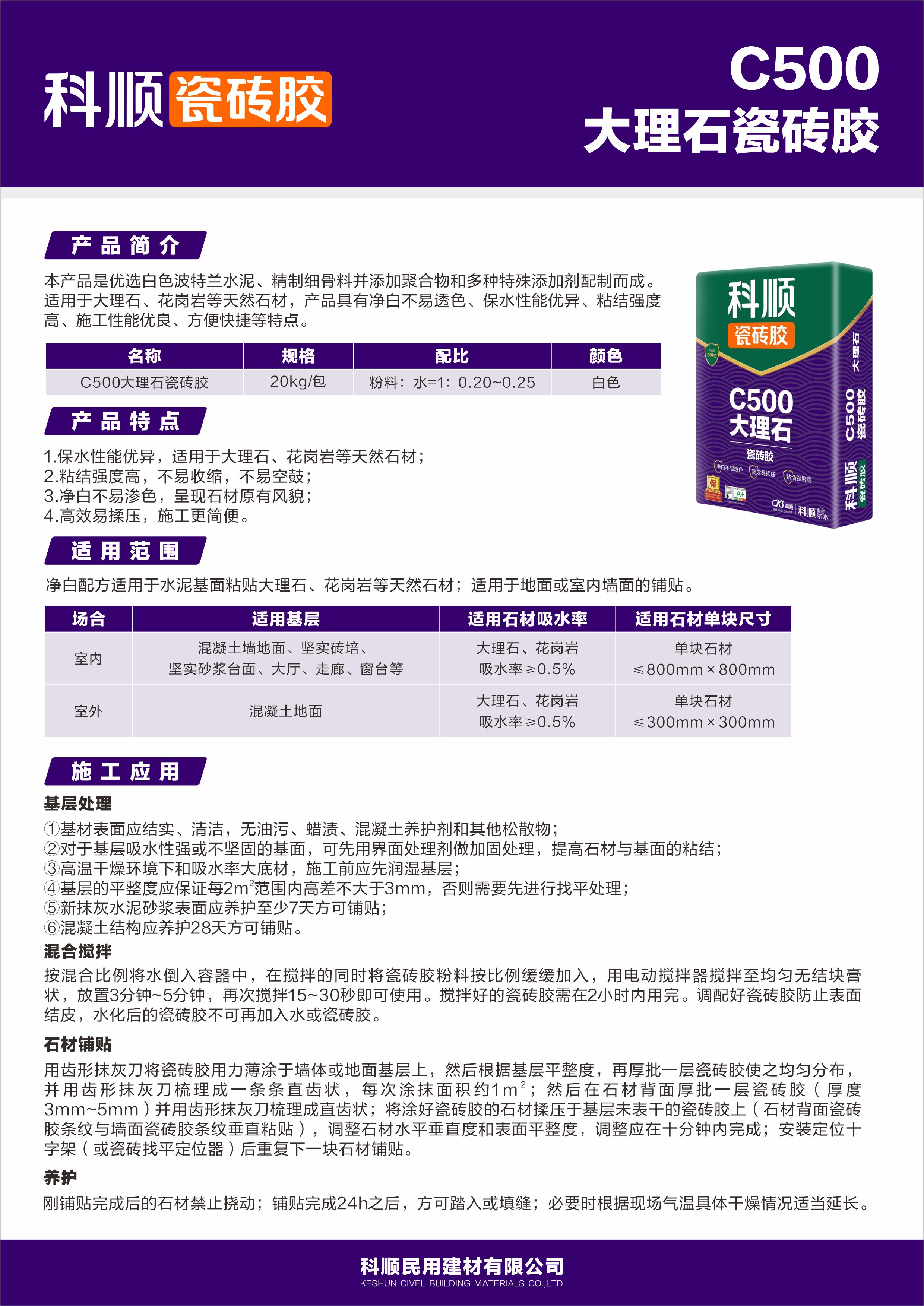 C500大理石瓷砖胶优选白色波特兰水泥、精制细骨料并添加聚合物和多种特殊添加剂配制而成。适用于大理石、花岗岩等天然石材,产品具有净白不易透色、保水性能优异、粘结强度高、施工性能优良、方便快捷等特点。