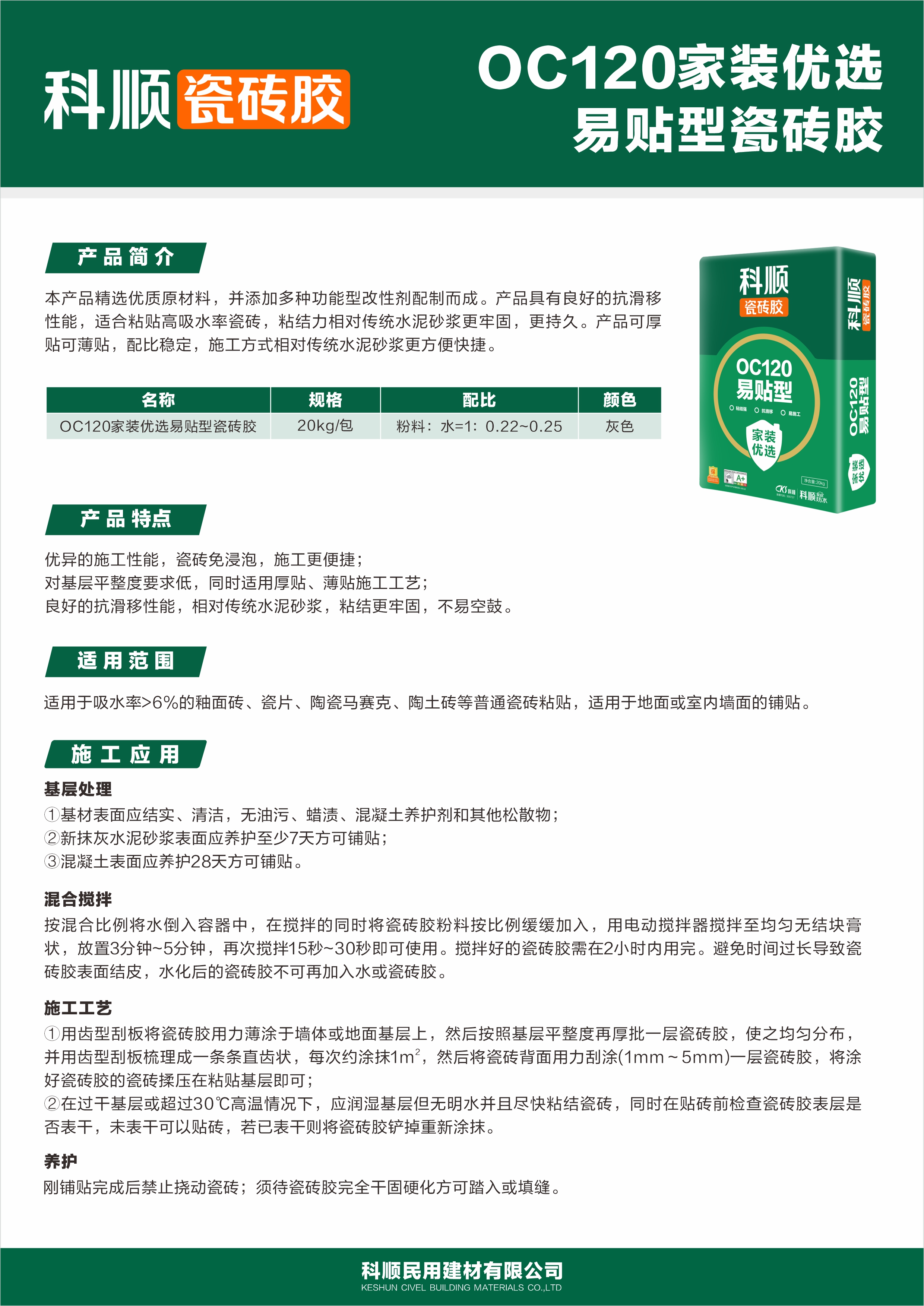 OC120家装优选易贴型瓷砖胶精选优质原材料,并添加多种功能型改性剂配制而成。产品具有良好的抗滑移性能,适合粘贴高吸水率瓷砖,粘结力相对传统水泥砂浆更牢固、更持久。产品可厚贴可薄贴,配比稳定,施工方式相对传统水泥砂浆更方便快捷。