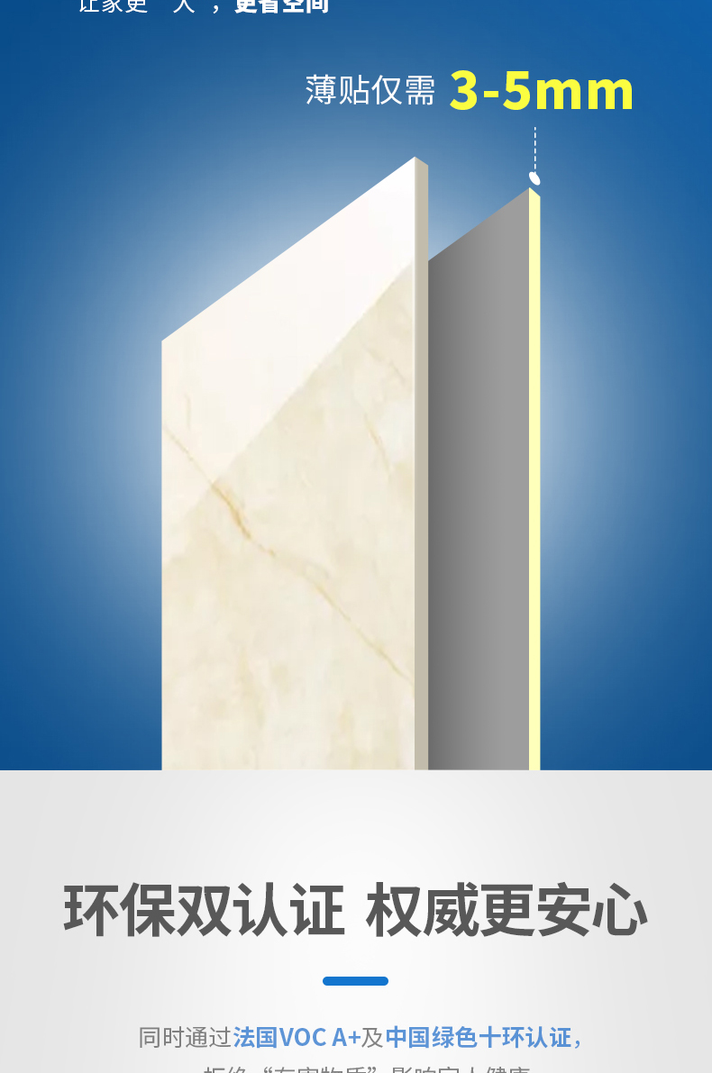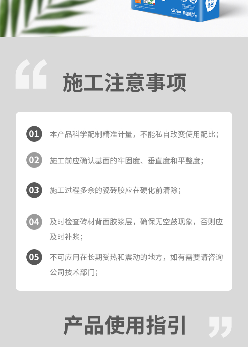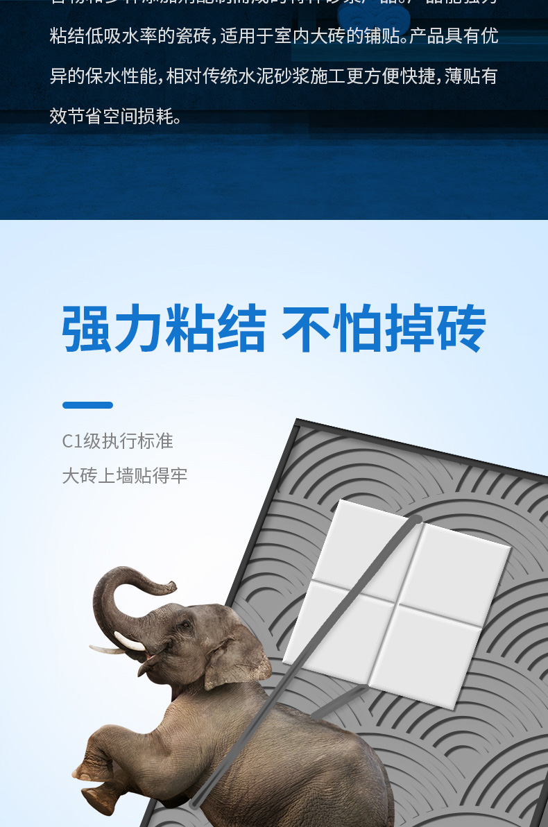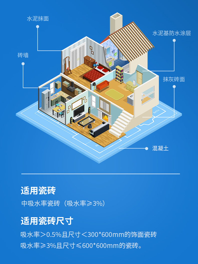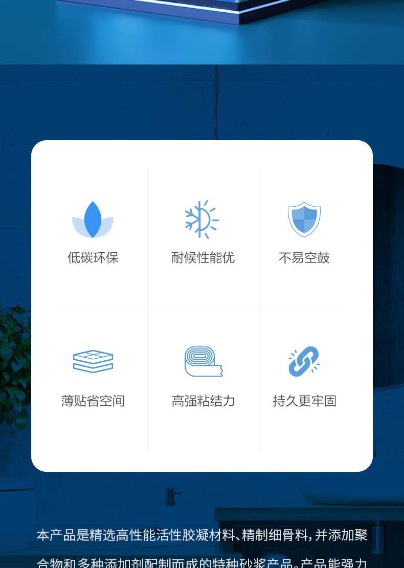 本产品是精选高性能活性胶凝材料、精制细骨料,并添加聚合物和多种添加剂配制而成的特种砂浆产品。产品能强力粘结低吸水率的瓷砖,适用于室内大砖的铺贴。产品具有优异的保水性能,相对传统水泥砂浆施工更方便快捷,薄贴有效节省空间损耗。