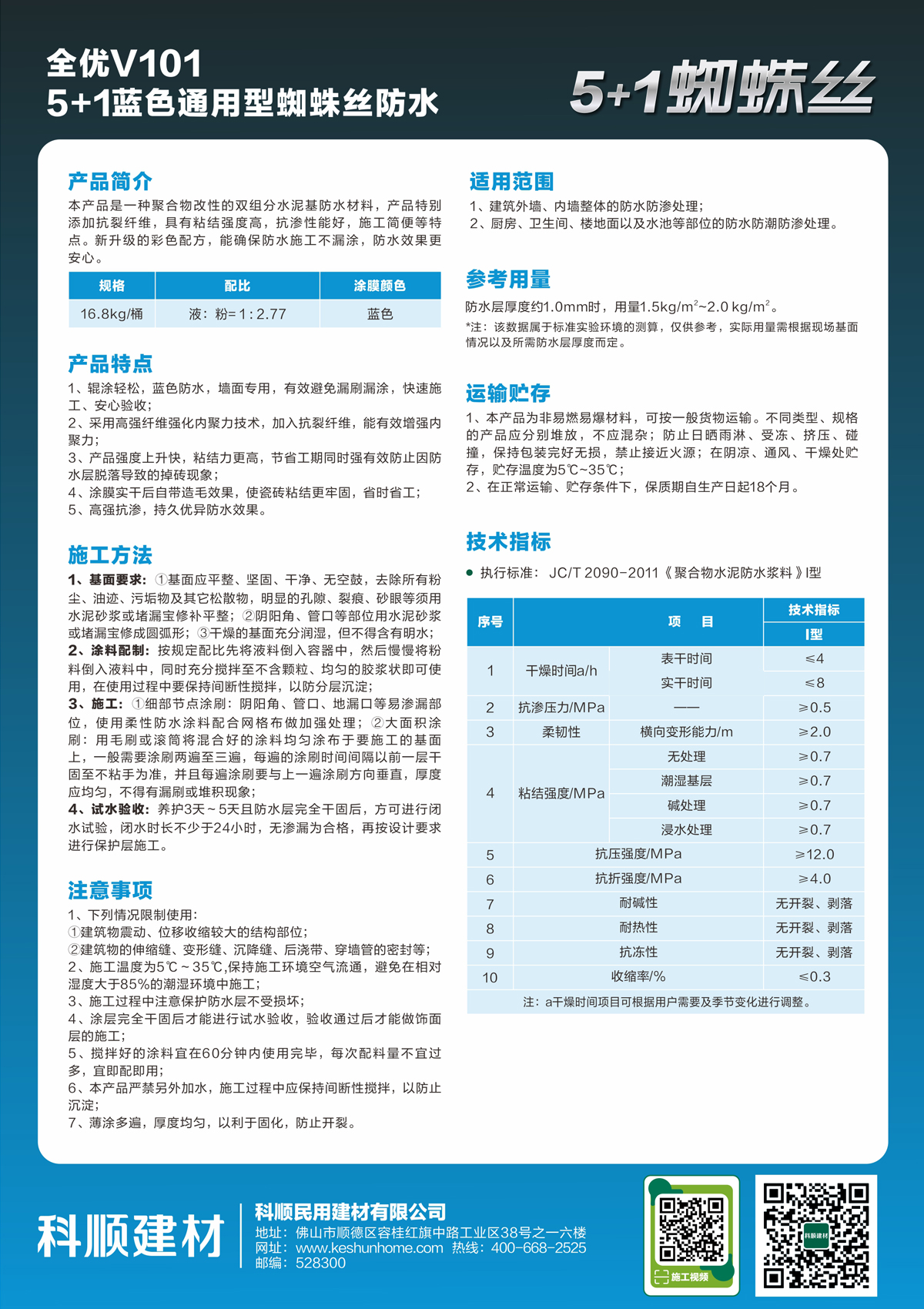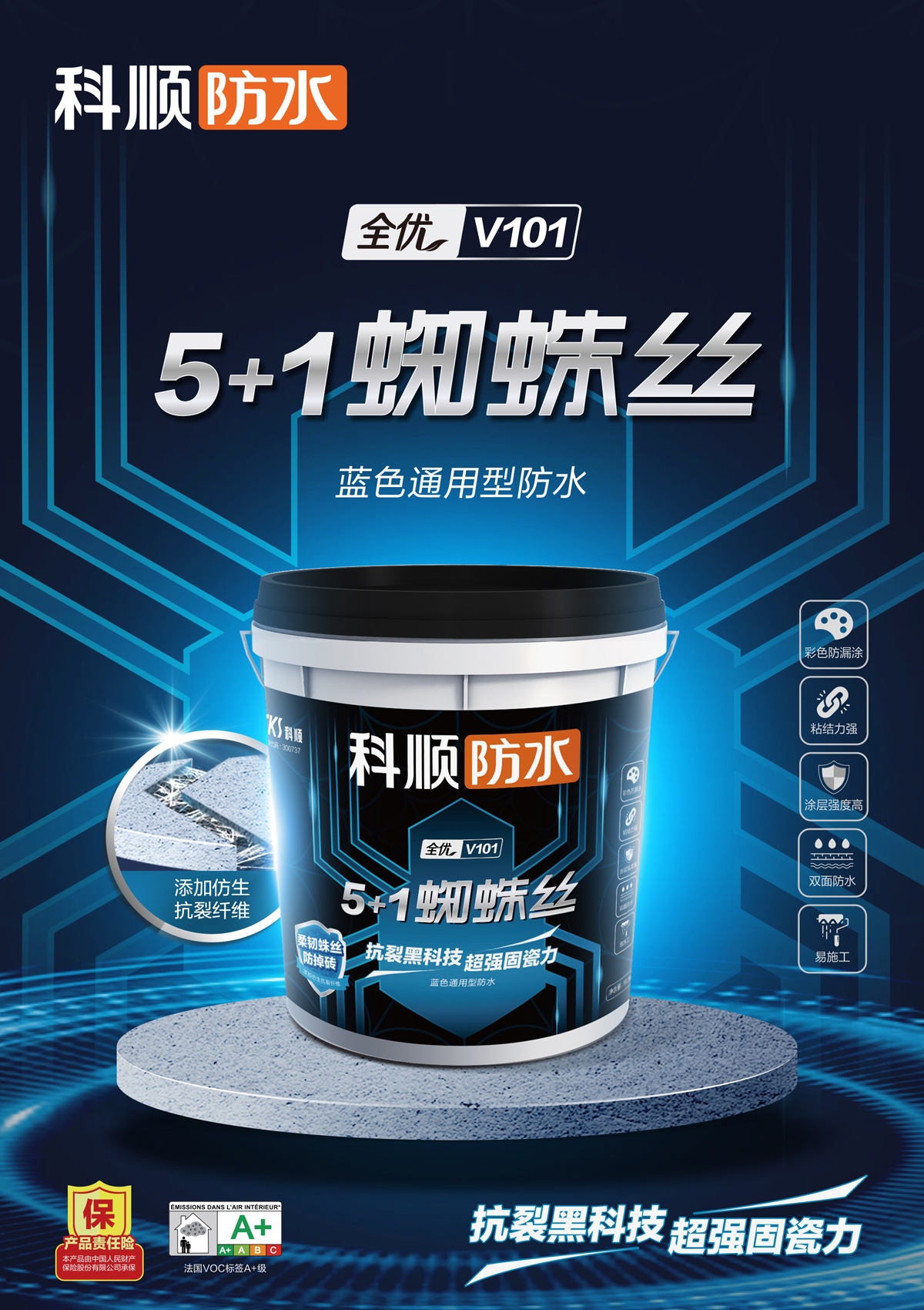 V101全优5+1蓝色通用型蜘蛛丝防水是一种聚合物改性的双组份水泥基防水材料,产品特别添加抗裂纤维,具有粘结强度高,抗渗性能好,施工简便等特点。新升级的彩色配方,能确保防水施工不漏涂,防水效果更安心。