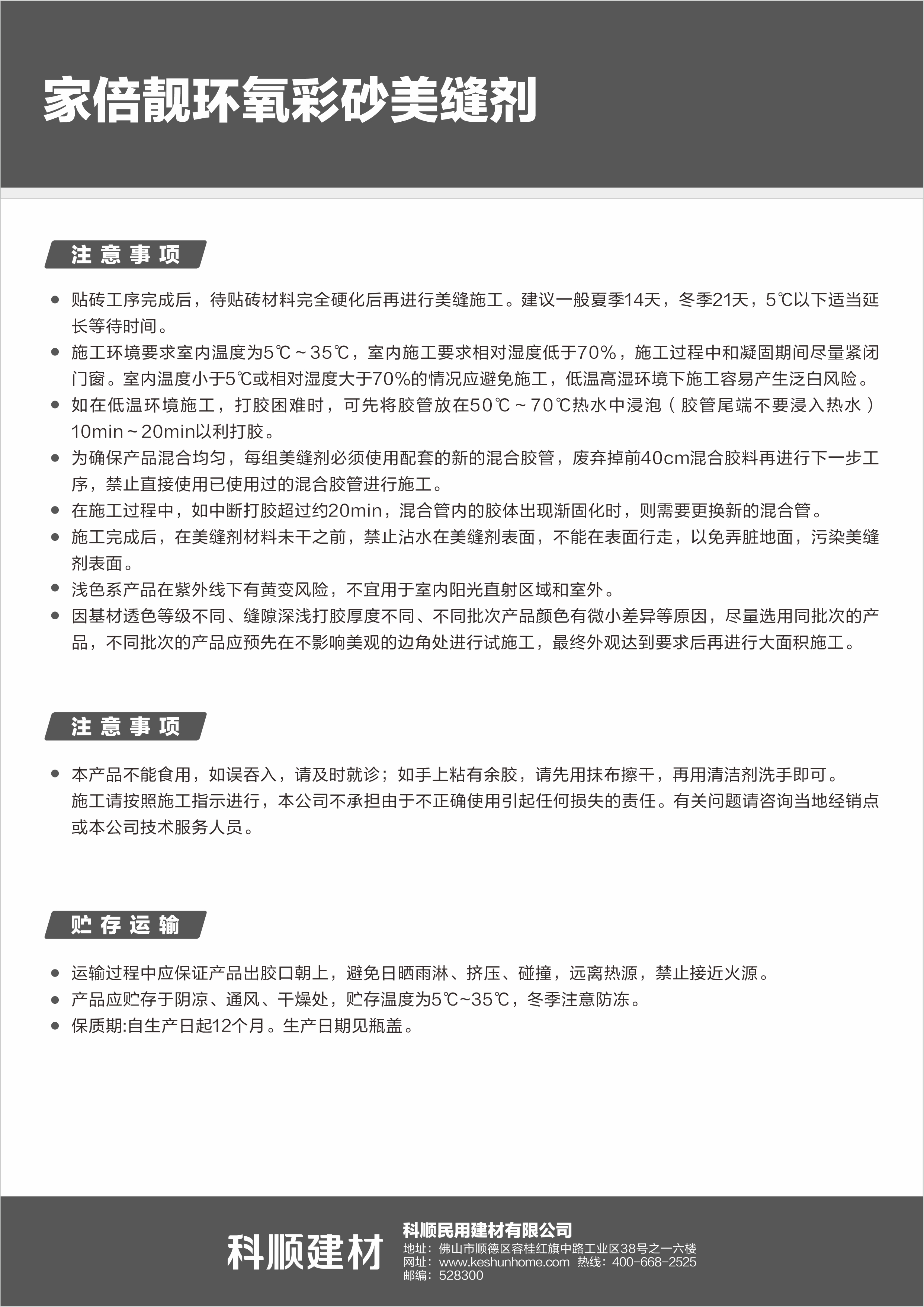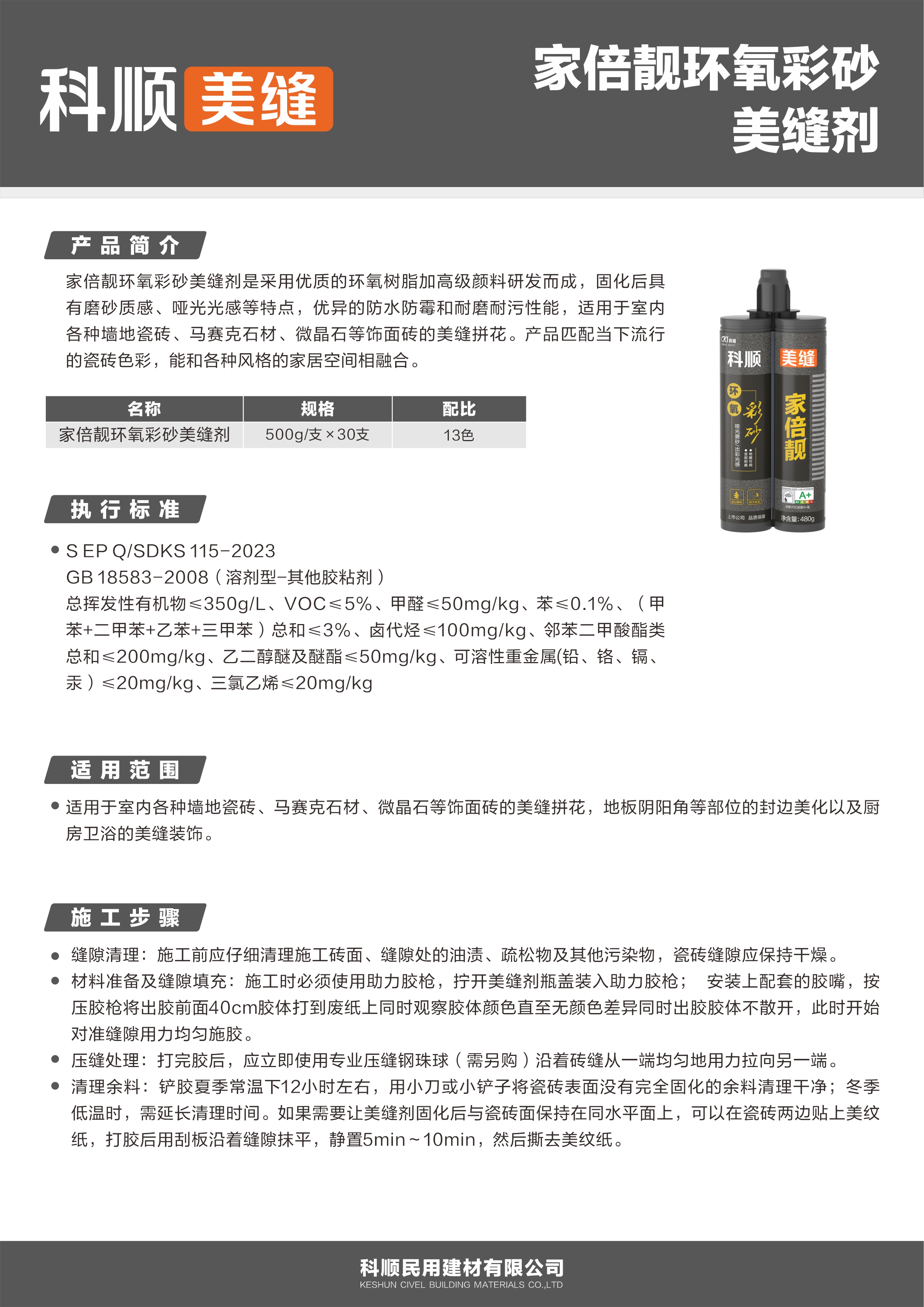 家倍靓环氧彩砂美缝剂是采用优质的环氧树脂加高级颜料研发而成,固化后具有磨砂质感、哑光光感等特点,优异的防水防霉和耐磨耐污性能,适用于室内各种墙地瓷砖、马赛克石材、微晶石等饰面砖的美缝拼花。产品匹配当下流行美缝科顺的瓷砖色彩,能和各种风格的家居空间相融合。