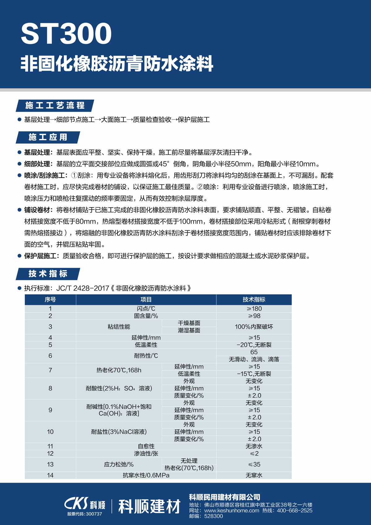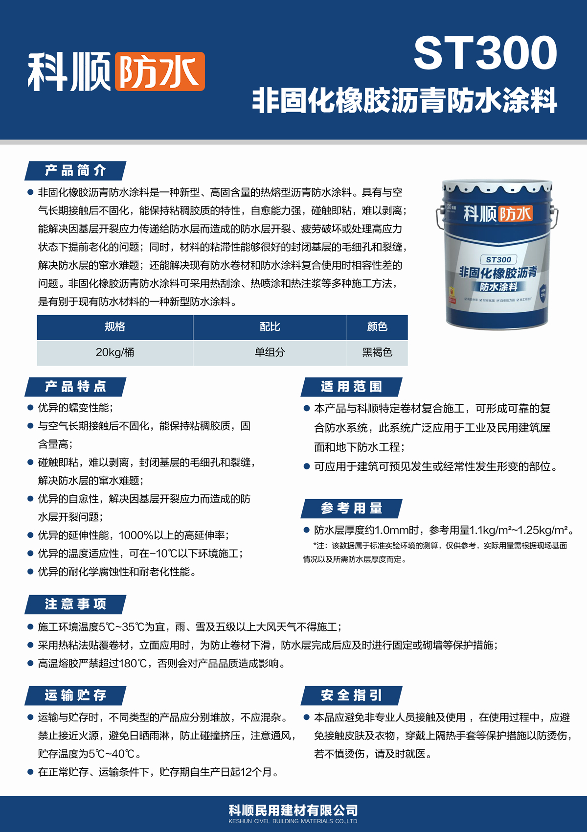 非固化橡胶沥青防水涂料是一种新型、高固含量的热熔型沥青防水涂料。具有与空气长期接触后不固化,能保持粘稠胶质的特性,自愈能力强,碰触即粘,难以剥离;能解决因基层开裂应力传递给防水层而造成的防水层开裂、疲劳破坏或处理高应力状态下提前老化的问题;同时,材料的粘滞性能够很好的封闭基层的毛细孔和裂缝,解决防水层的窜水难题;还能解决现有防水卷材和防水涂料复合使用时相容性差的问题。非固化橡胶沥青防水涂料可采用热刮涂、热喷涂和热注浆等多种施工方法,是有别于现有防水材料的一种新型防水涂料。