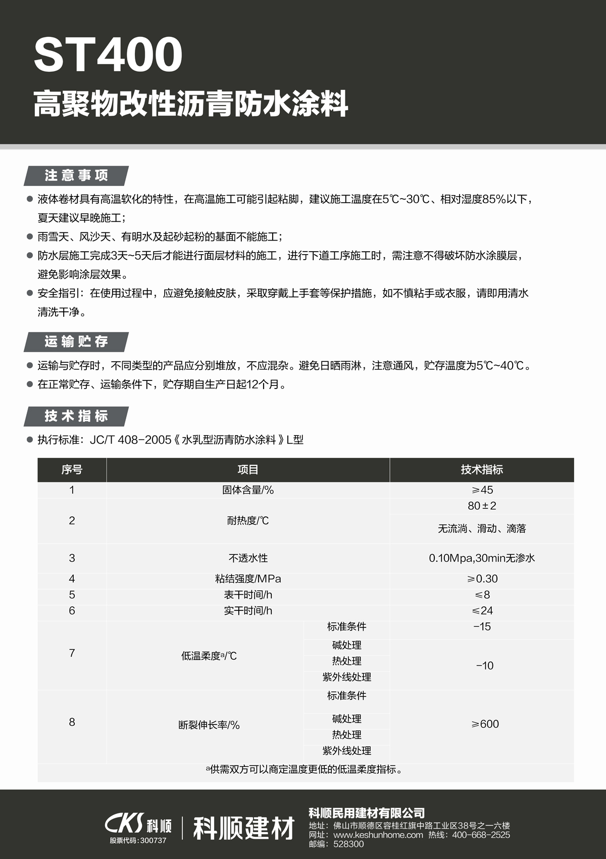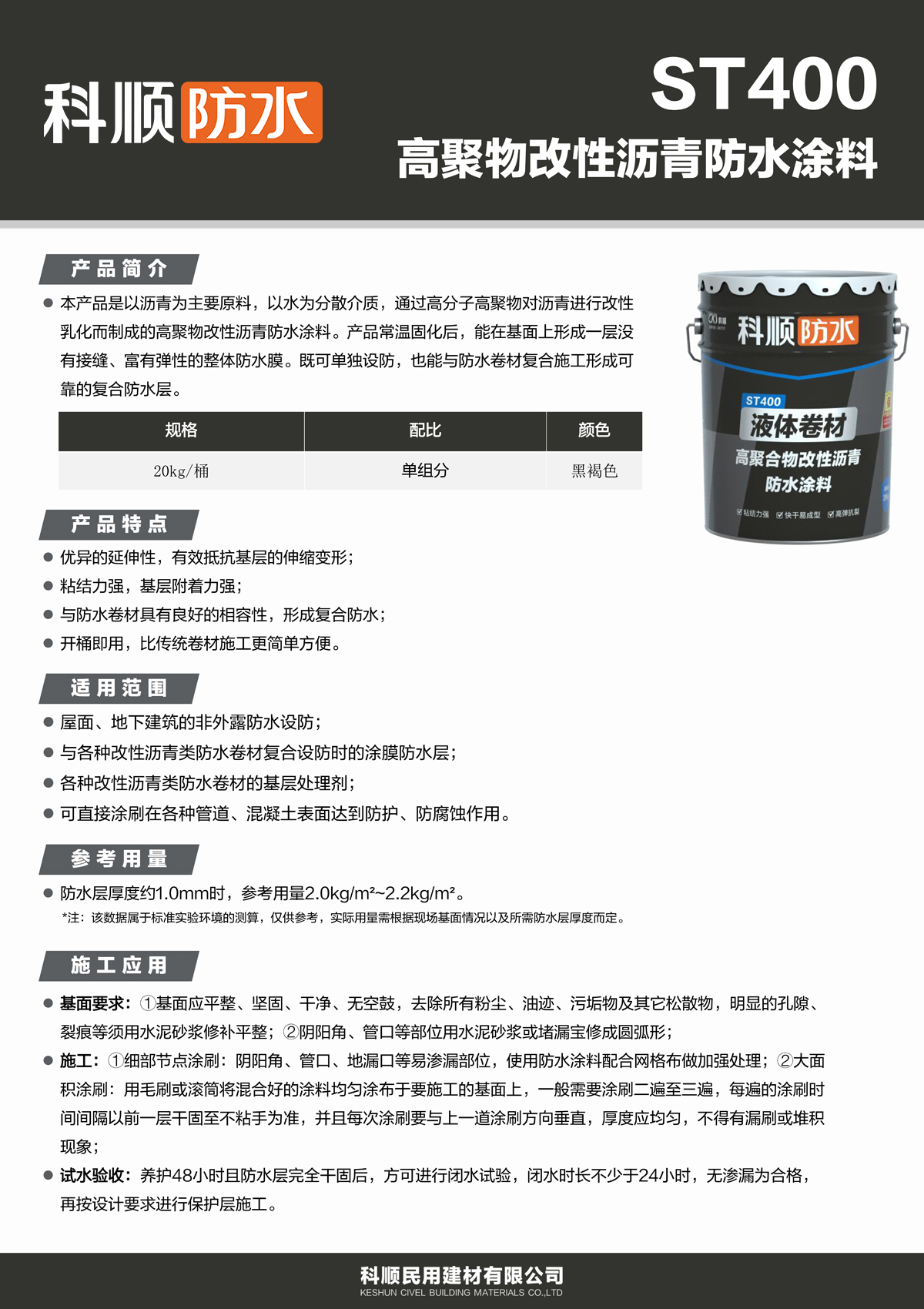 本产品是以沥青为主要原料,以水为分散介质,通过高分子高聚物对沥青进行改性乳化而制成的高聚物改性沥青防水涂料。产品常温固化后,能在基面上形成一层没有接缝、富有弹性的整体防水膜。既可单独设防,也能与防水卷材复合施工形成可靠的复合防水层。