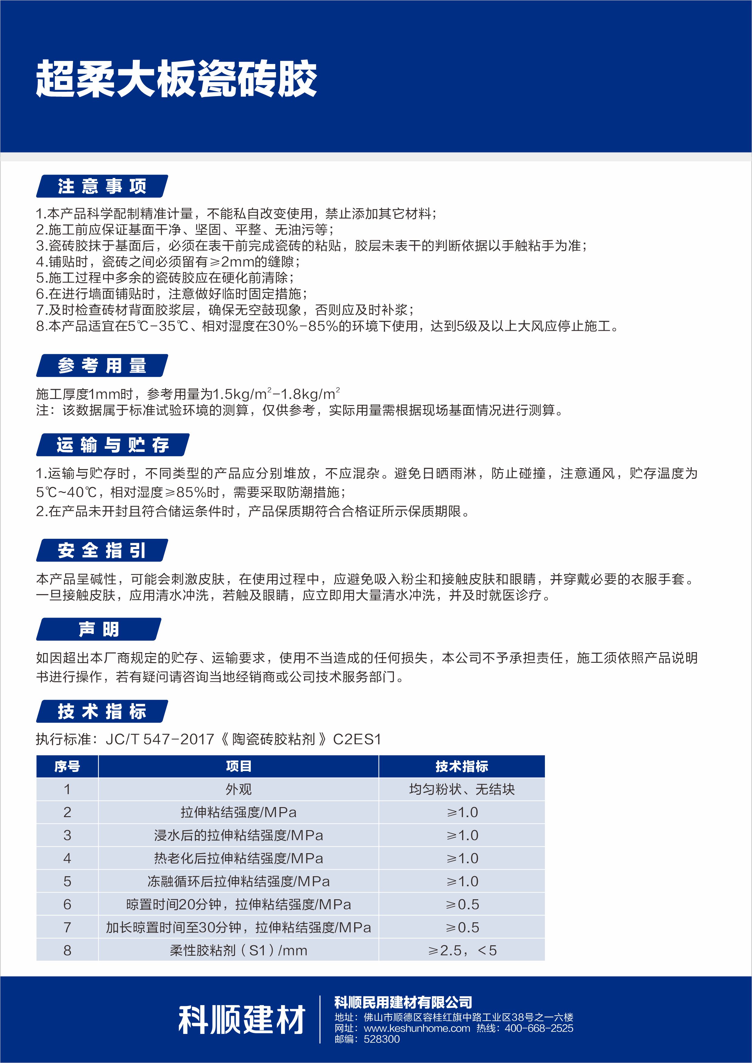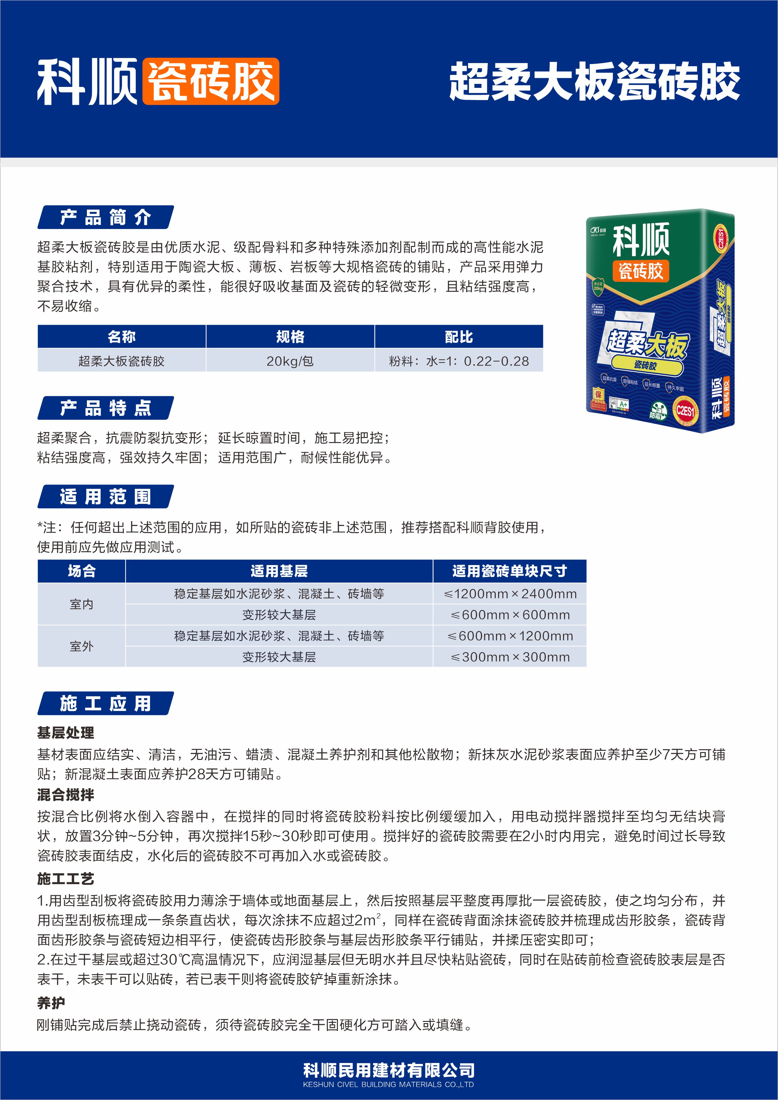 超柔大板瓷砖胶是由优质水泥、级配骨料和多种特殊添加剂配制而成的高性能水泥基胶粘剂,特别适用于陶瓷大板、薄板、岩板等大规格瓷砖的铺贴,产品采用弹力聚合技术,具有优异的柔性,能很好吸收基面及瓷砖的轻微变形,且粘结强度高,不易收缩。