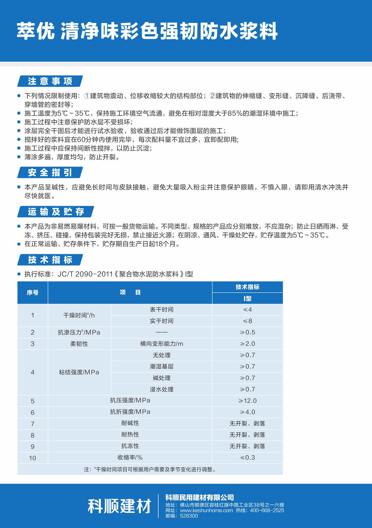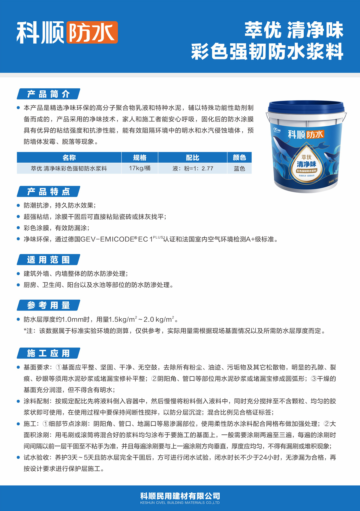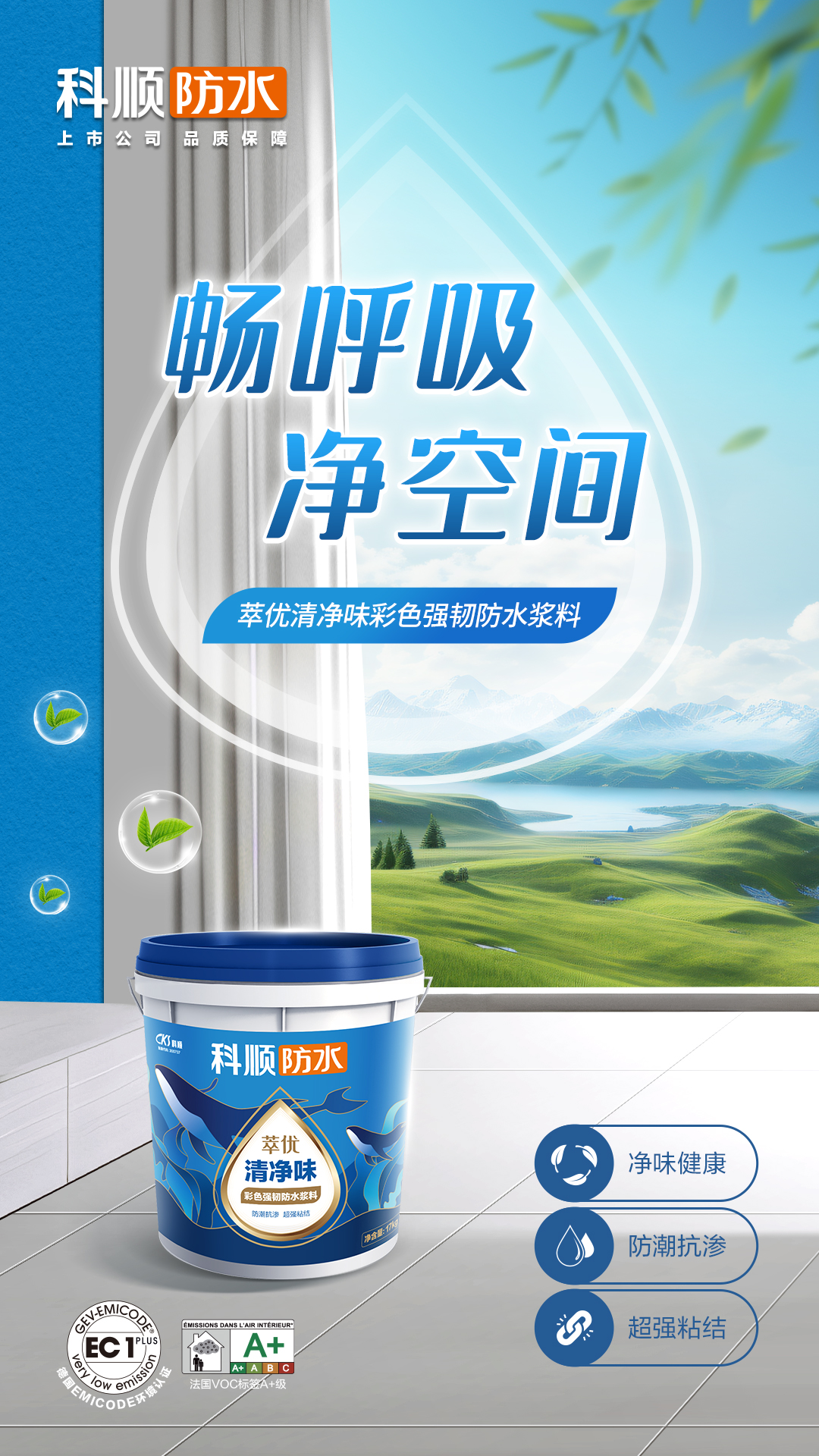 本产品是精选净味环保的高分子聚合物乳液和特种水泥,辅以特殊功能性助剂制备而成的,产品采用的净味技术,家人和施工者能安心呼吸,固化后的防水涂膜具有优异的粘结强度和抗渗性能,能有效阻隔环境中的明水和水汽侵蚀墙体,预防墙体发霉、脱落等现象。