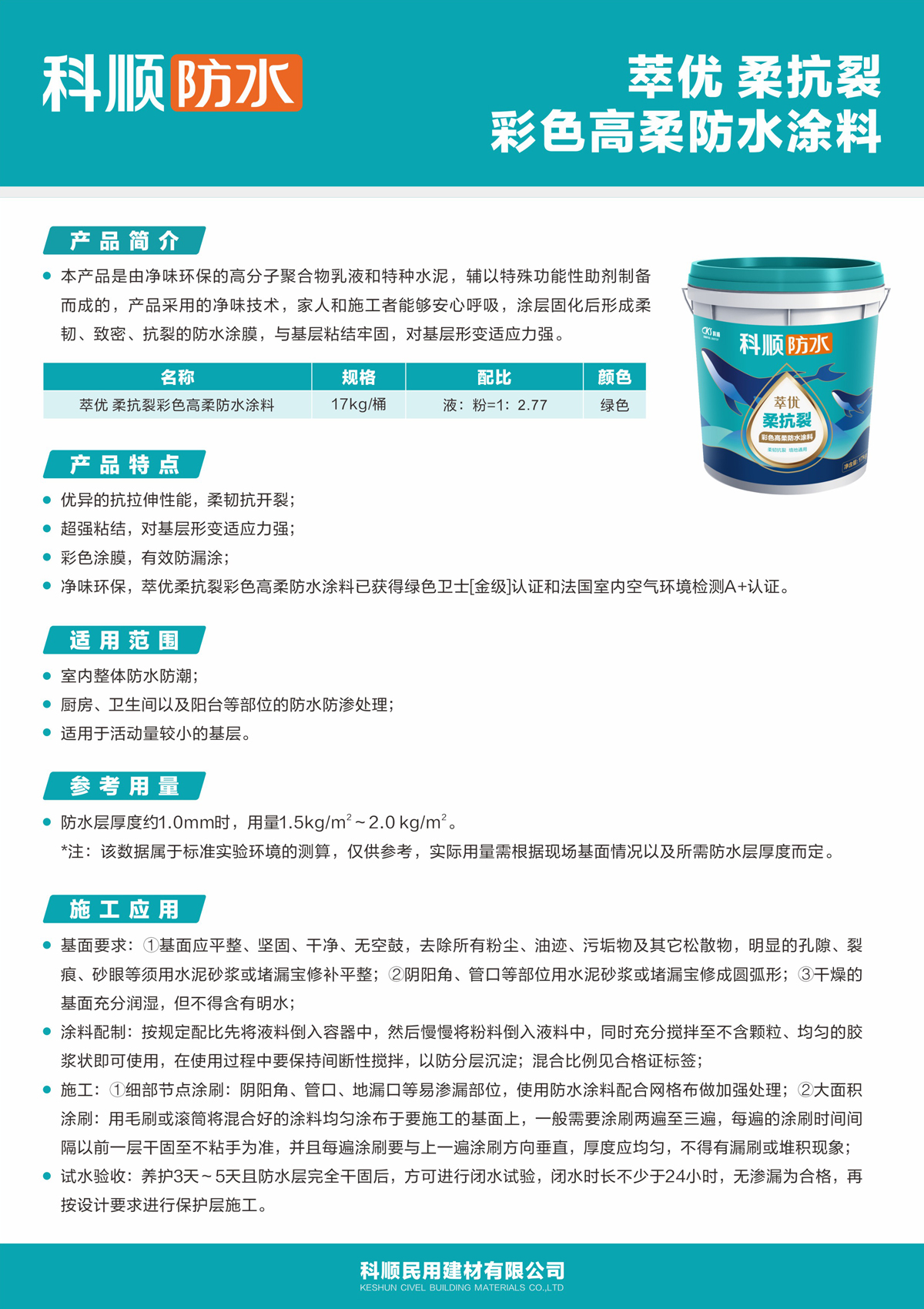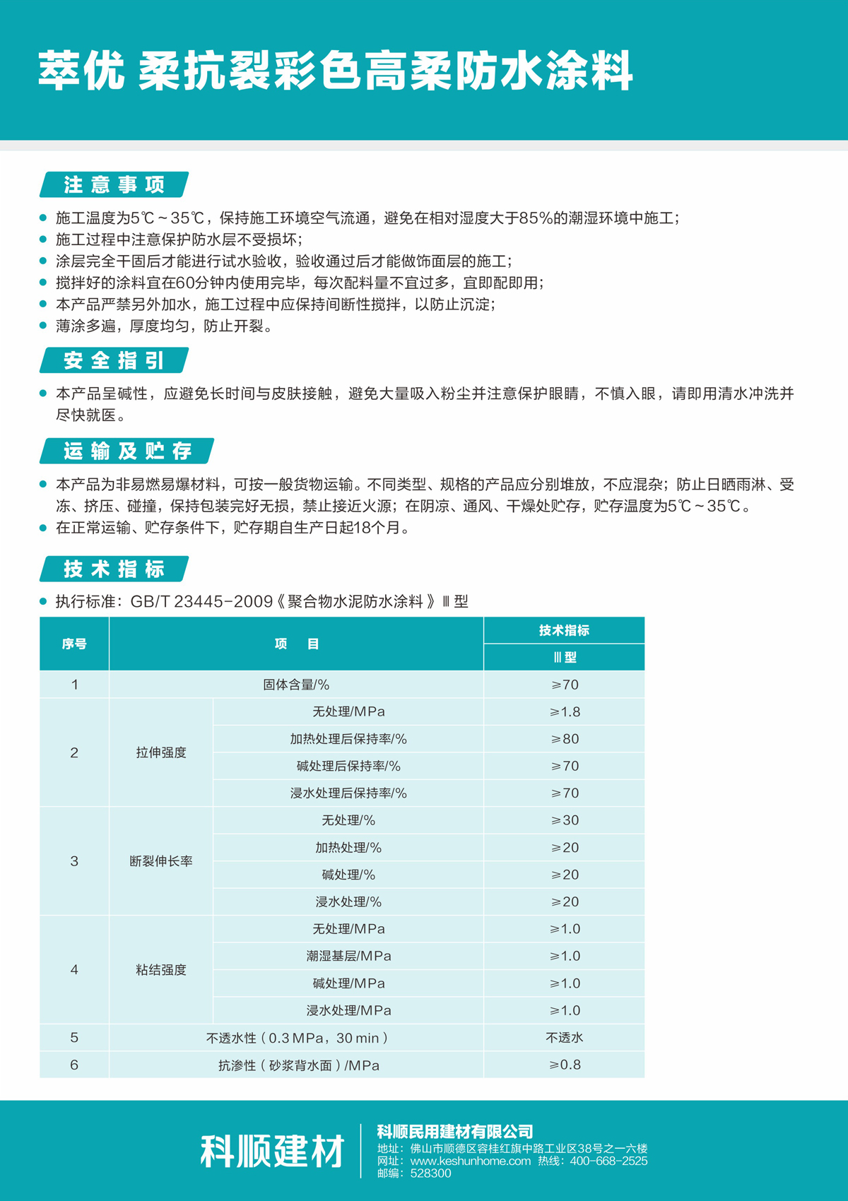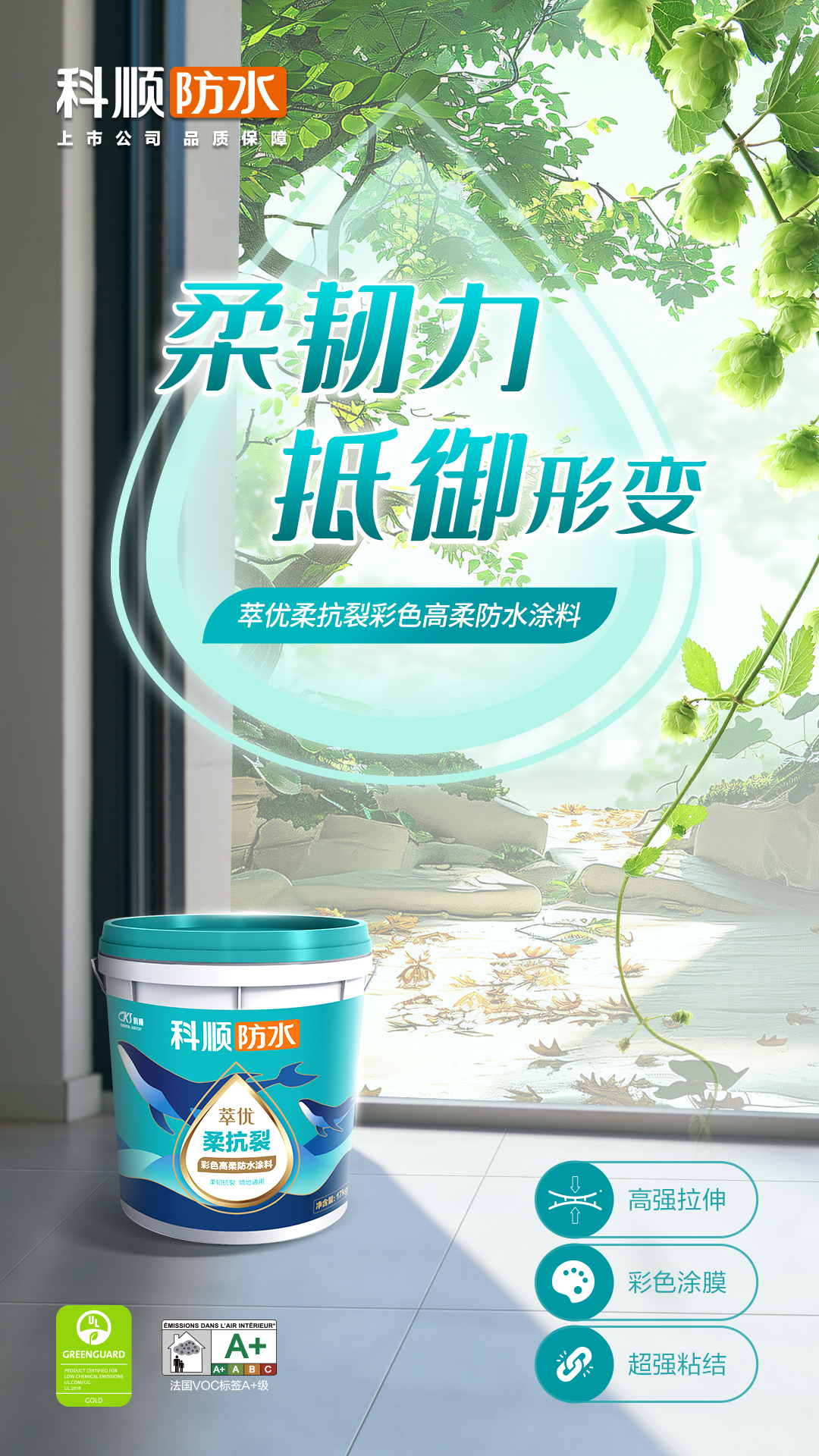本产品是由净味环保的高分子聚合物乳液和特种水泥,辅以特殊功能性助剂制备而成的,产品采用的净味技术,家人和施工者能够安心呼吸,涂层固化后形成柔韧、致密、抗裂的防水涂膜,与基层粘结牢固,对基层形变适应力强。