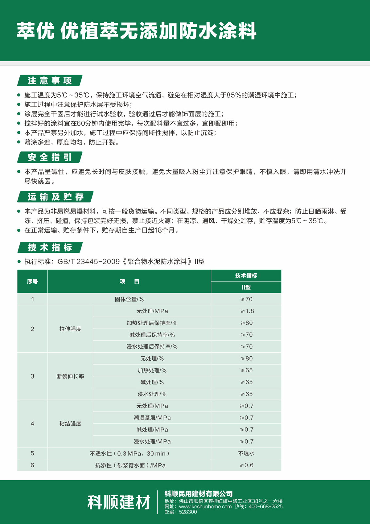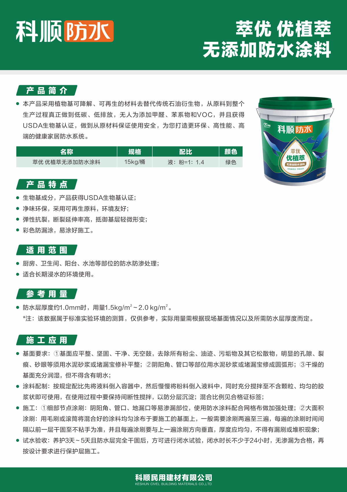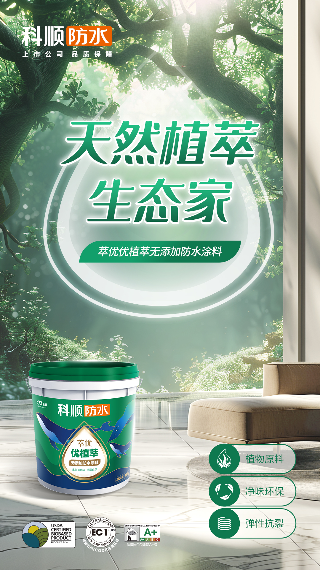 本产品采用植物基可降解、可再生的材料去替代传统石油衍生物,从原料到整个生产过程真正做到低碳、低排放,无人为添加甲醛、苯系物和VOC,并且获得USDA生物基认证,做到从原材料保证使用安全,为您打造更环保、高性能、高端的健康家居防水系统。