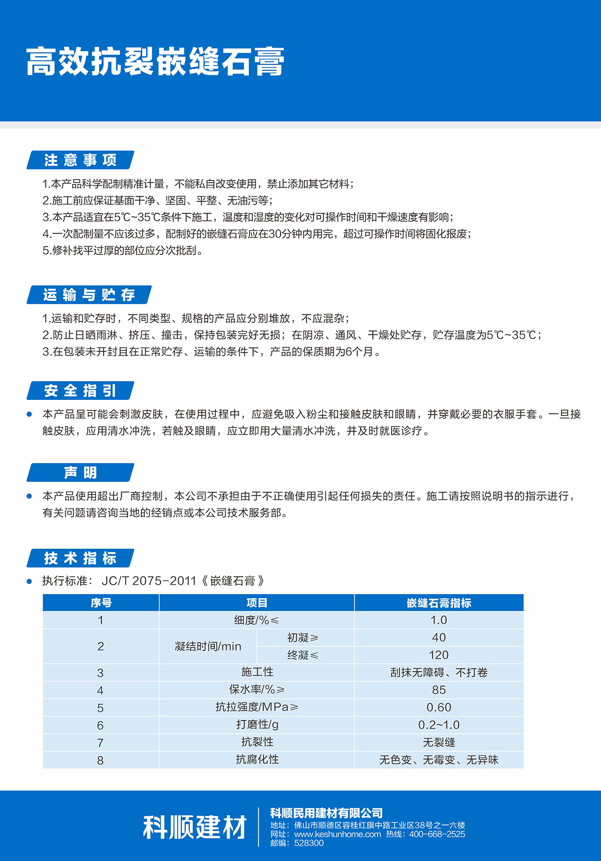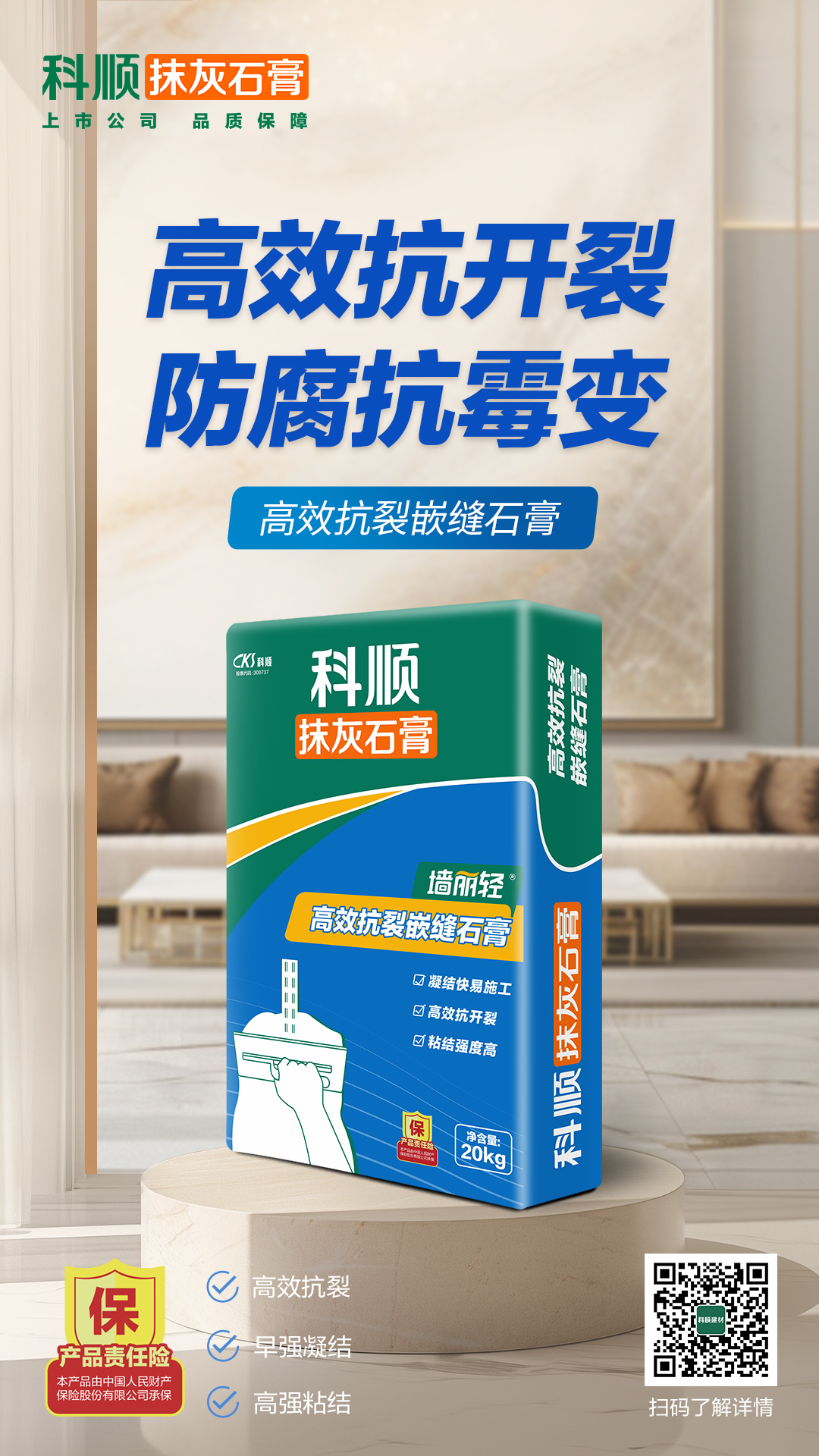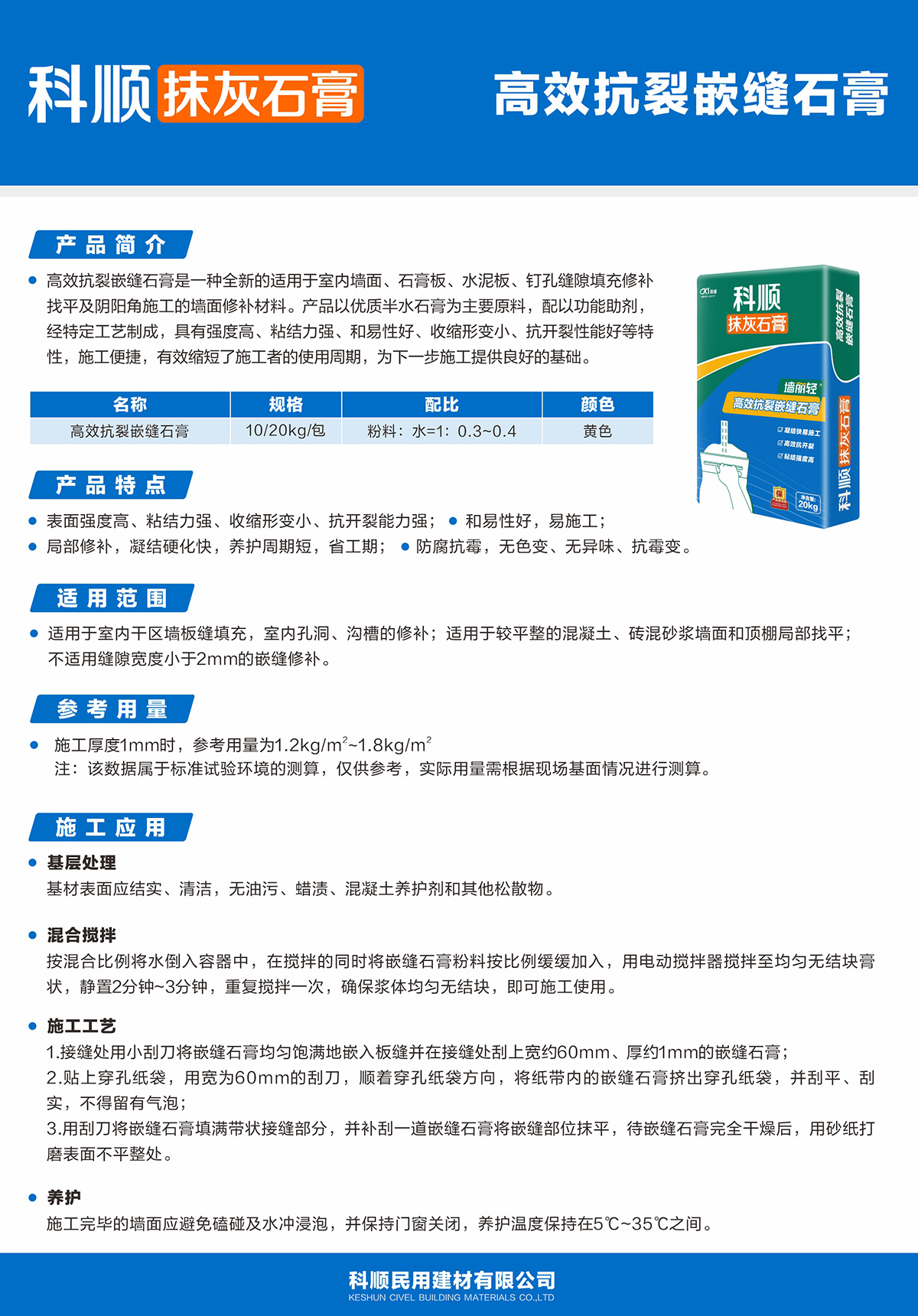 高效抗裂嵌缝石膏是一种全新的适用于室内墙面、石膏板、水泥板、钉孔缝隙填充修补 找平及阴阳角施工的墙面修补材料。产品以优质半水石膏为主要原料,配以功能助剂, 经特定工艺制成,具有强度高、粘结力强、和易性好、收缩形变小、抗开裂性能好等特 性,施工便捷,有效缩短了施工者的使用周期,为下一步施工提供良好的基础。