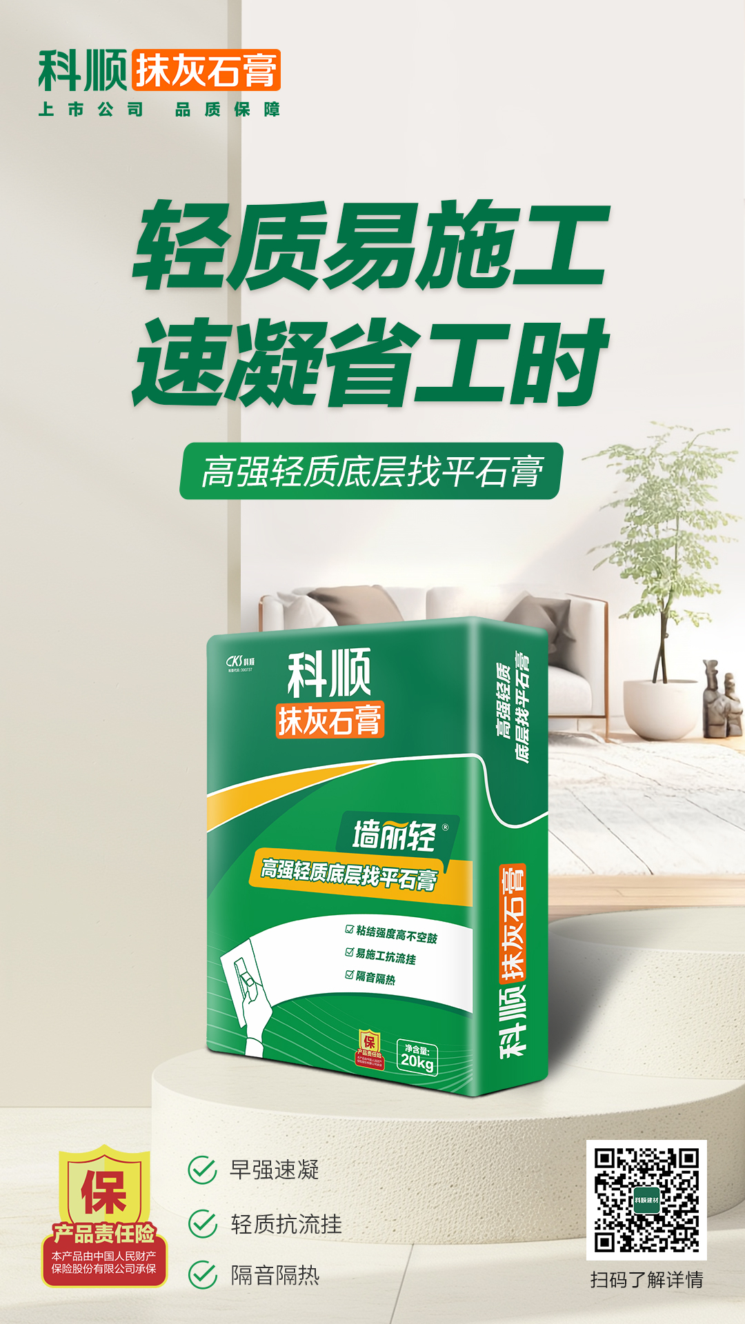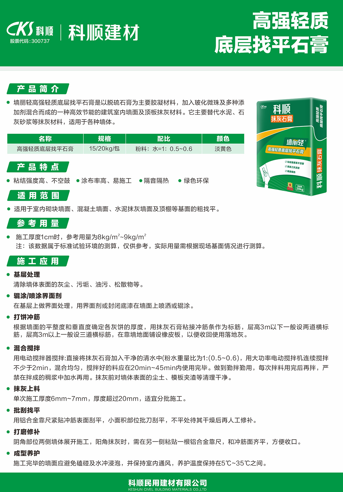 墙丽轻高强轻质底层找平石膏是以脱硫石膏为主要胶凝材料,加入玻化微珠及多种添 加剂混合而成的一种高效节能的建筑室内墙面及顶板抹灰材料。它主要替代水泥、石 灰砂浆等抹灰材料,适用于各种墙体。