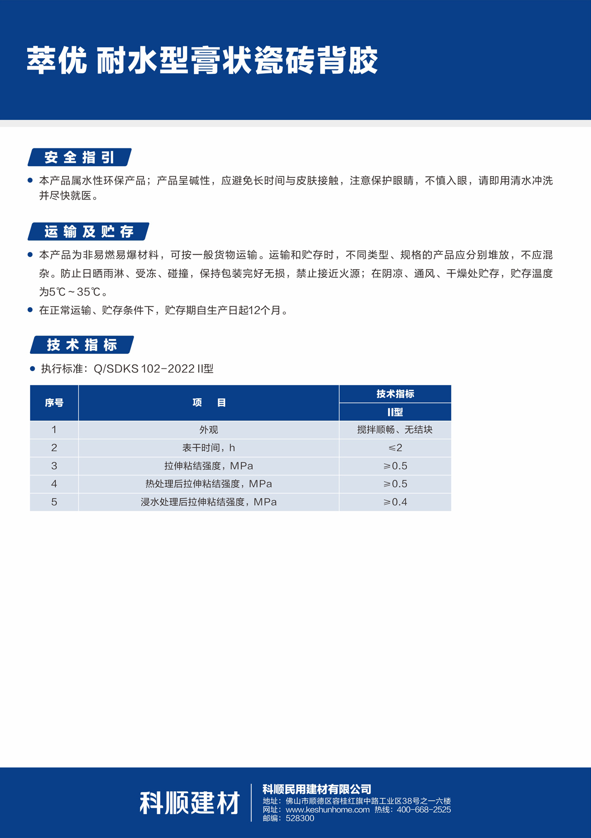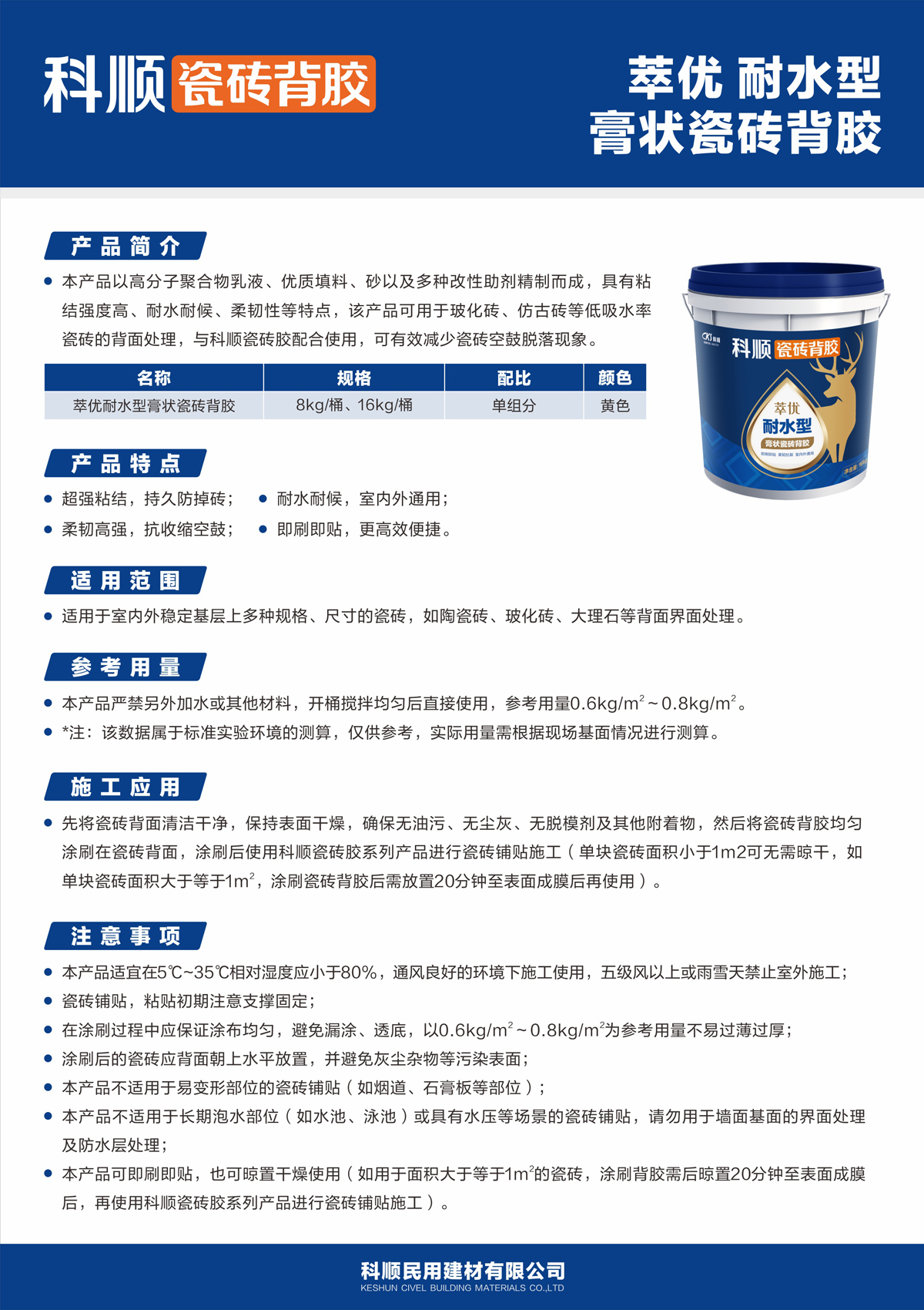 本产品以高分子聚合物乳液、优质填料、砂以及多种改性助剂精制而成,具有粘结强度高、耐水耐候、柔韧性等特点,该产品可用于玻化砖、仿古砖等低吸水率瓷砖的背面处理,与科顺瓷砖胶配合使用,可有效减少瓷砖空鼓脱落现象。