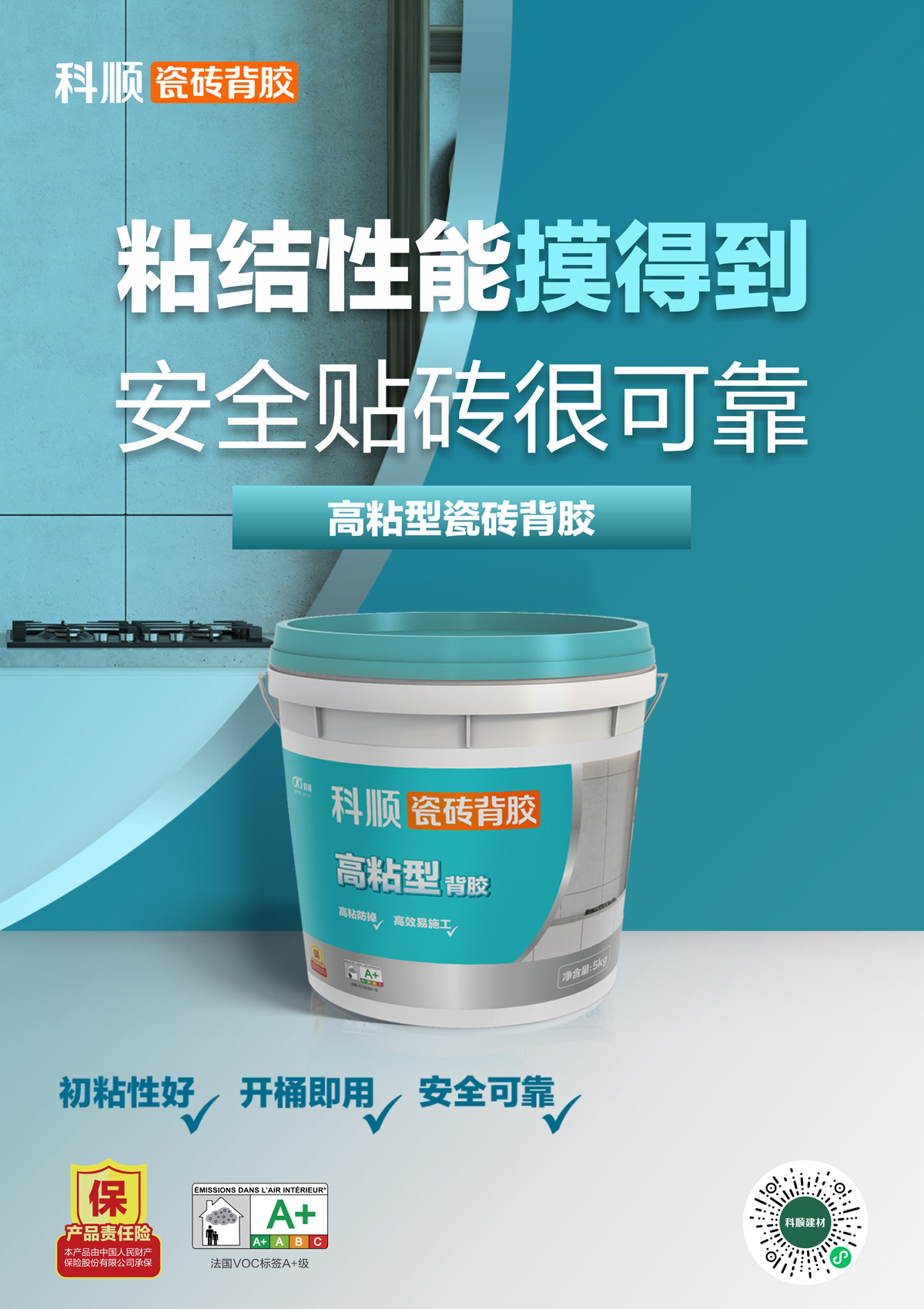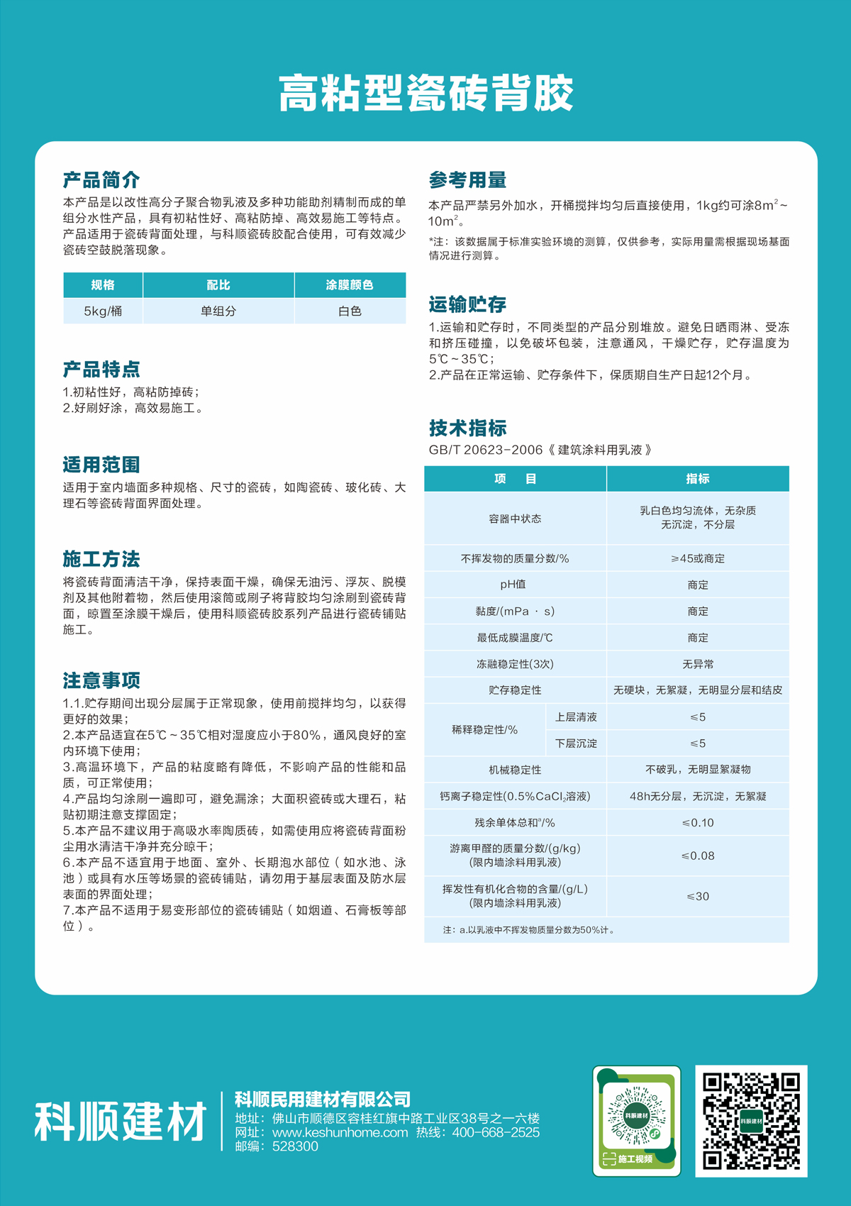 本产品是以改性高分子聚合物乳液及多种功能助剂精制而成的单组分水性产品,具有初粘性好、高粘防掉、高效易施工等特点。产品适用于瓷砖背面处理,与科顺瓷砖胶配合使用,可有效减少瓷砖空鼓脱落现象。