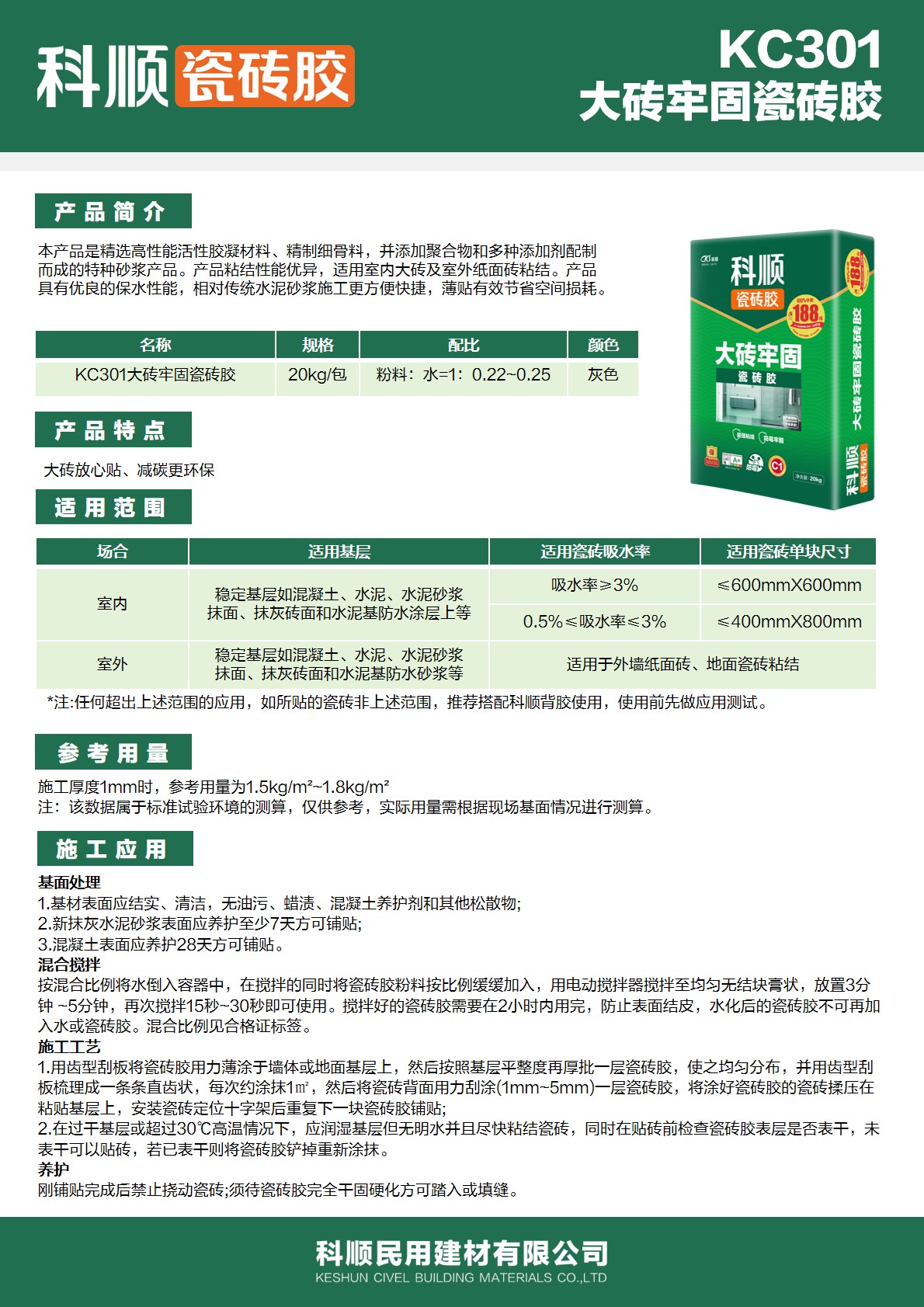 本产品是精选高性能活性胶凝材料,精制细骨料,并添加聚合物和多种添加剂配制而成的特种砂浆产品。产品粘结性能优异,适用室内大砖及室外纸面砖粘结。产品具有优良的保水性能,相对传统水泥砂浆施工更方便快捷,薄贴有效节省空间耗损。