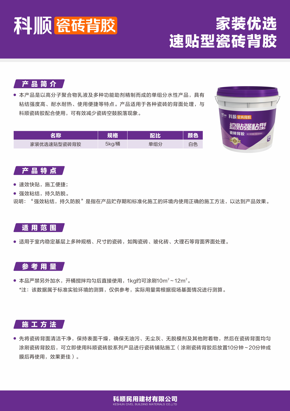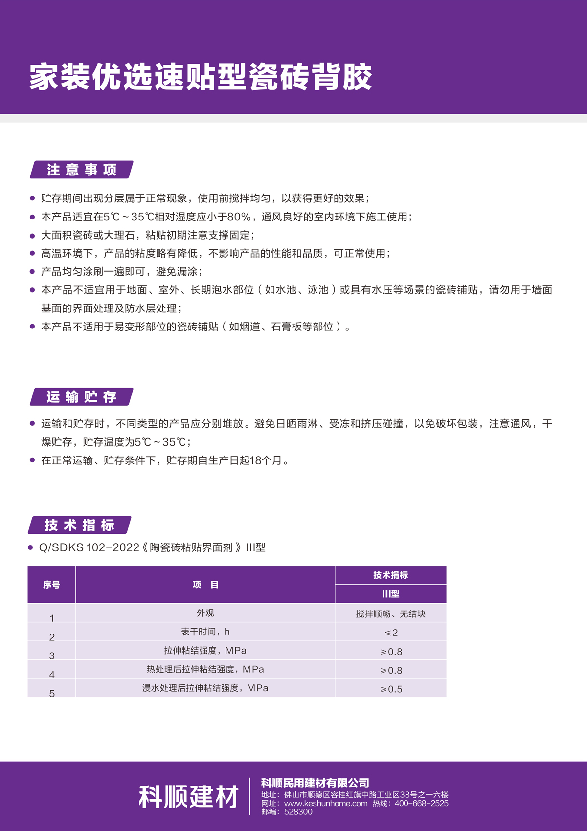 本产品是以高分子聚合物乳液及多种功能助剂精制而成的单组分水性产品,具有粘结强度高、耐水耐热、使用便捷等特点。产品适用于各种瓷砖的背面处理,与科顺瓷砖胶配合使用,可有效减少瓷砖空鼓脱落现象。