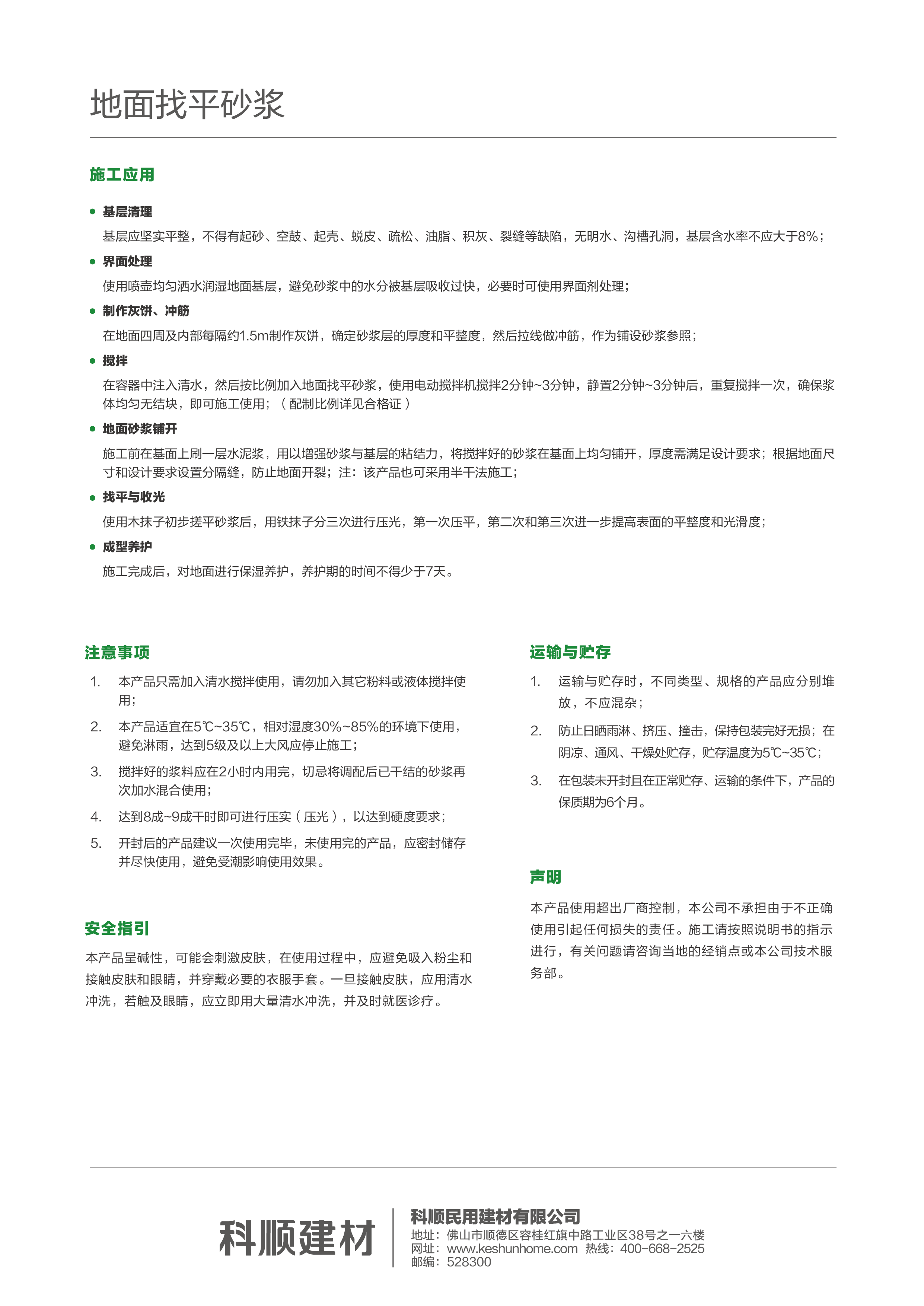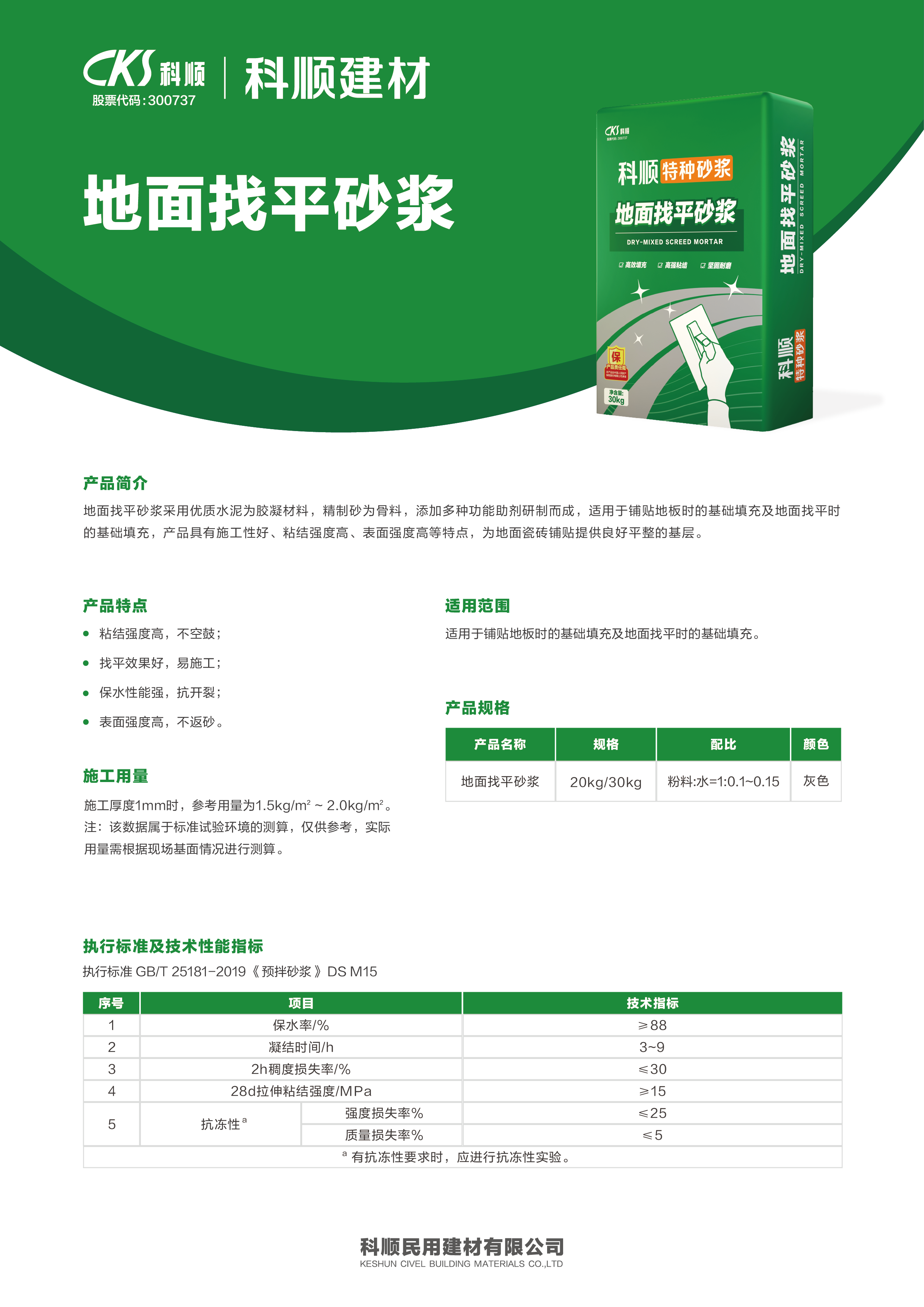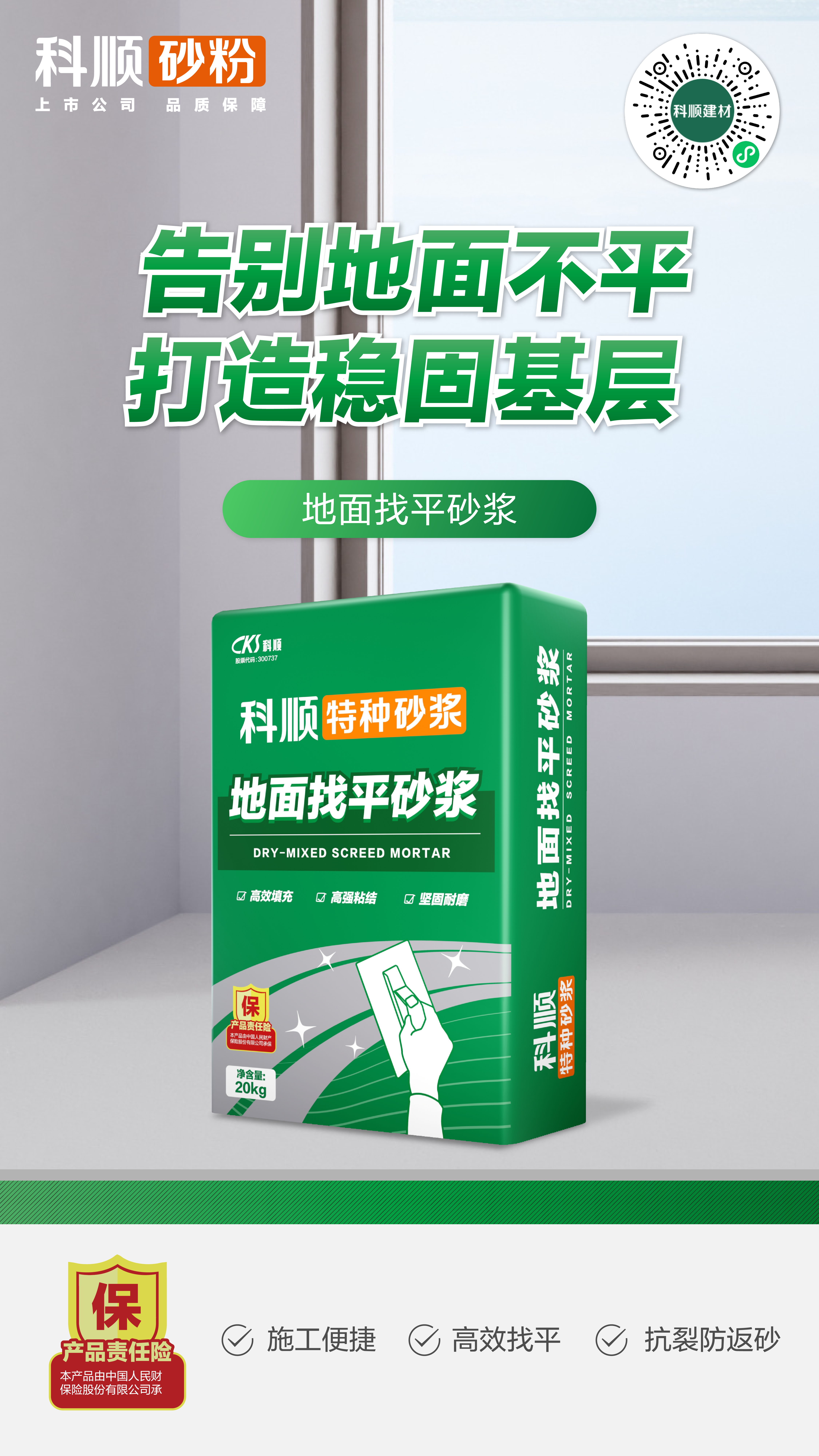 地面找平砂浆采用优质水泥为胶凝材料,精制砂为骨料,添加多种功能助剂研制而成,适用于铺贴地板时的基础填充及地面找平时的基础填充,产品具有施工性好、粘结强度高、表面强度高等特点,为地面瓷砖铺贴提供良好平整的基层。