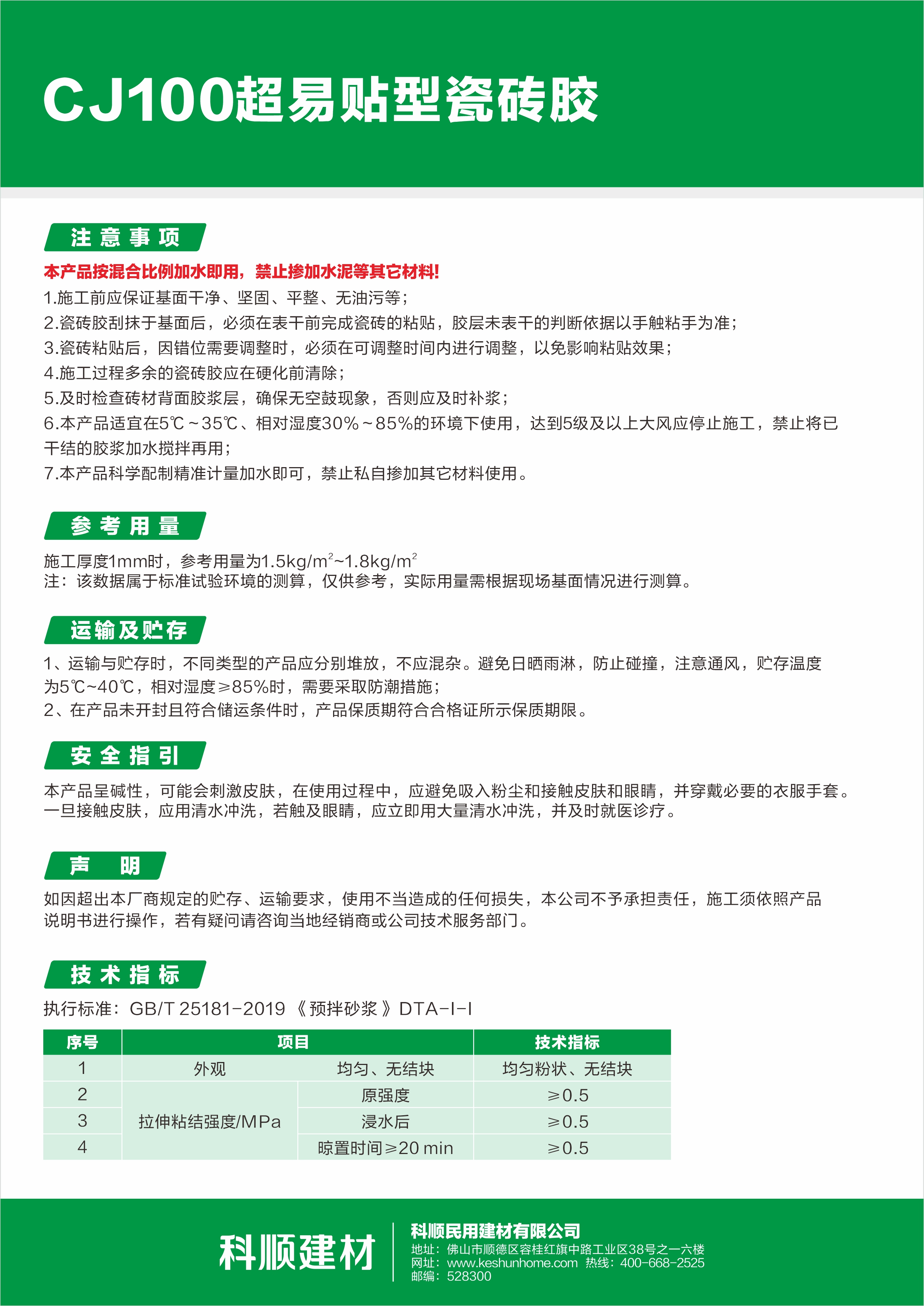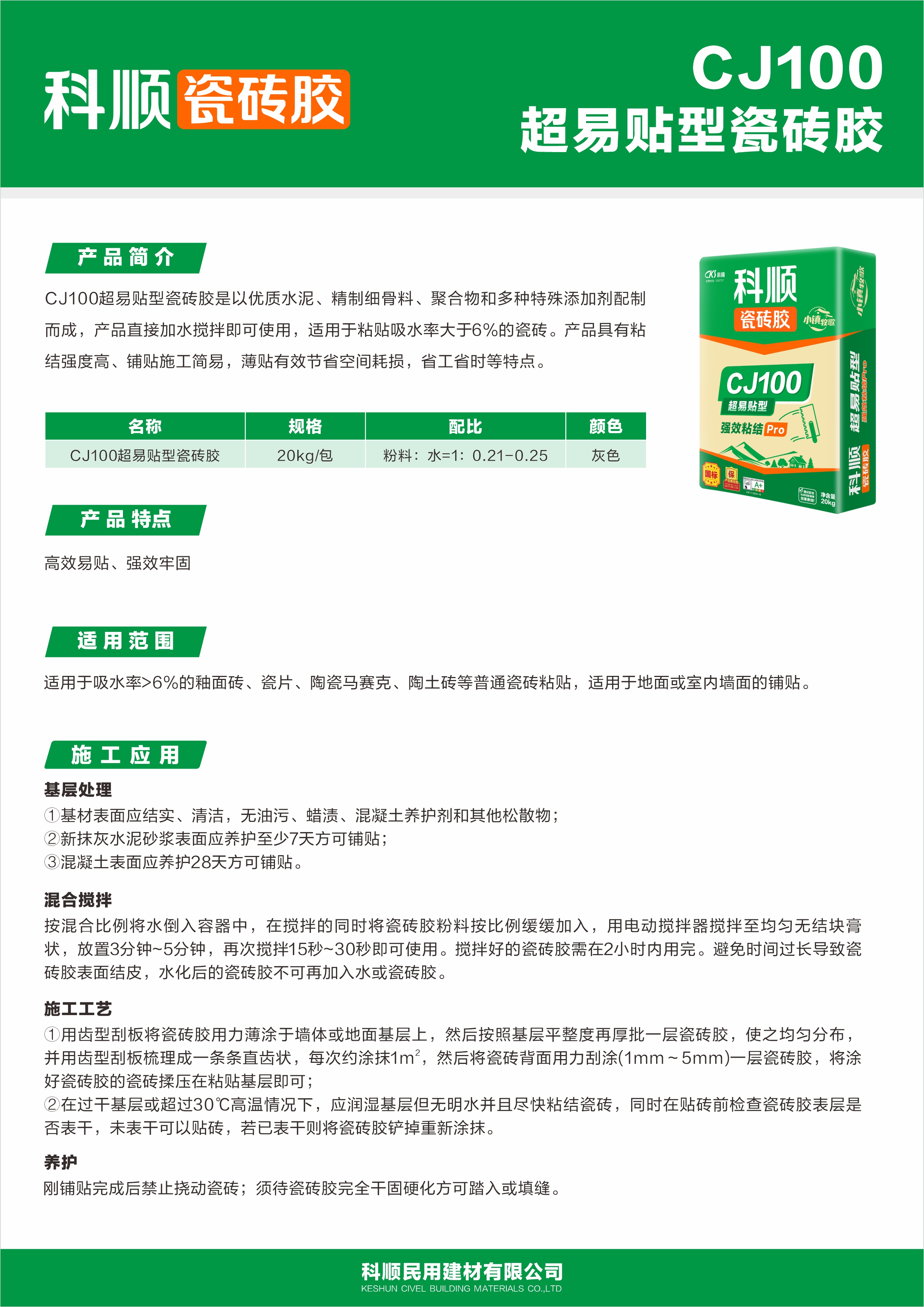 易批刮型瓷砖胶是以优质水泥、精致细骨料和改性聚合物和各种助剂经过科学配制而成的特种砂浆产品,产品直接加水搅拌即可使用,用于粘贴高吸水率瓷砖。相对于传统的水泥砂浆,产品具有粘结强度高、铺贴施工简易、薄贴有效节省空间损、省工省时等特点。