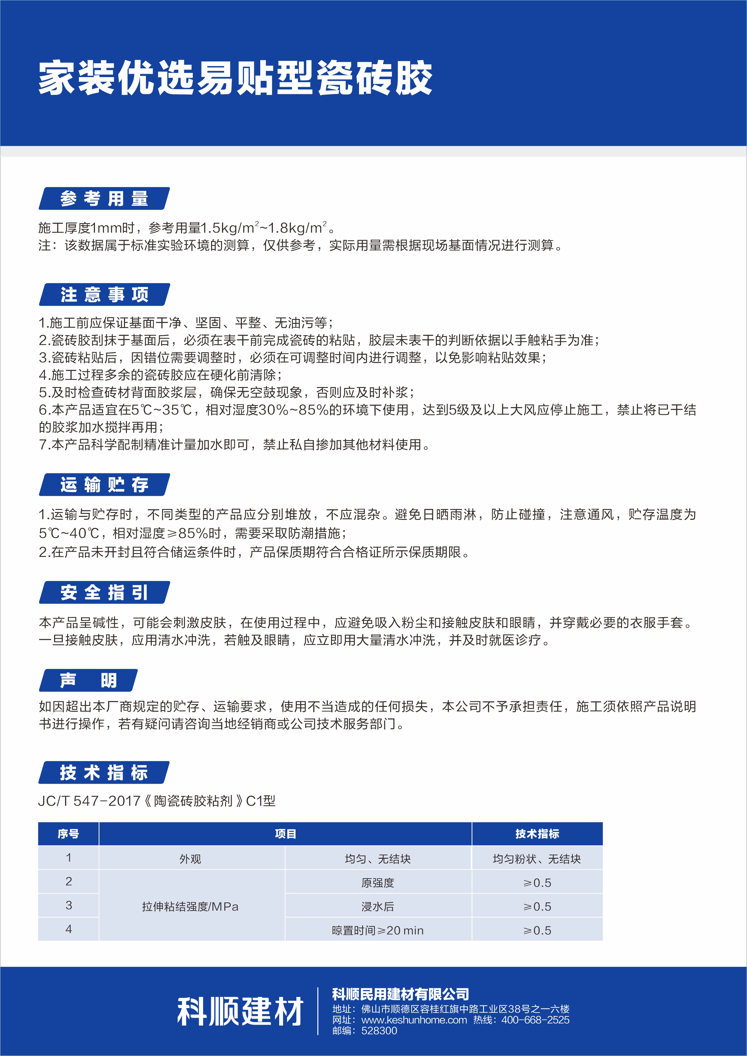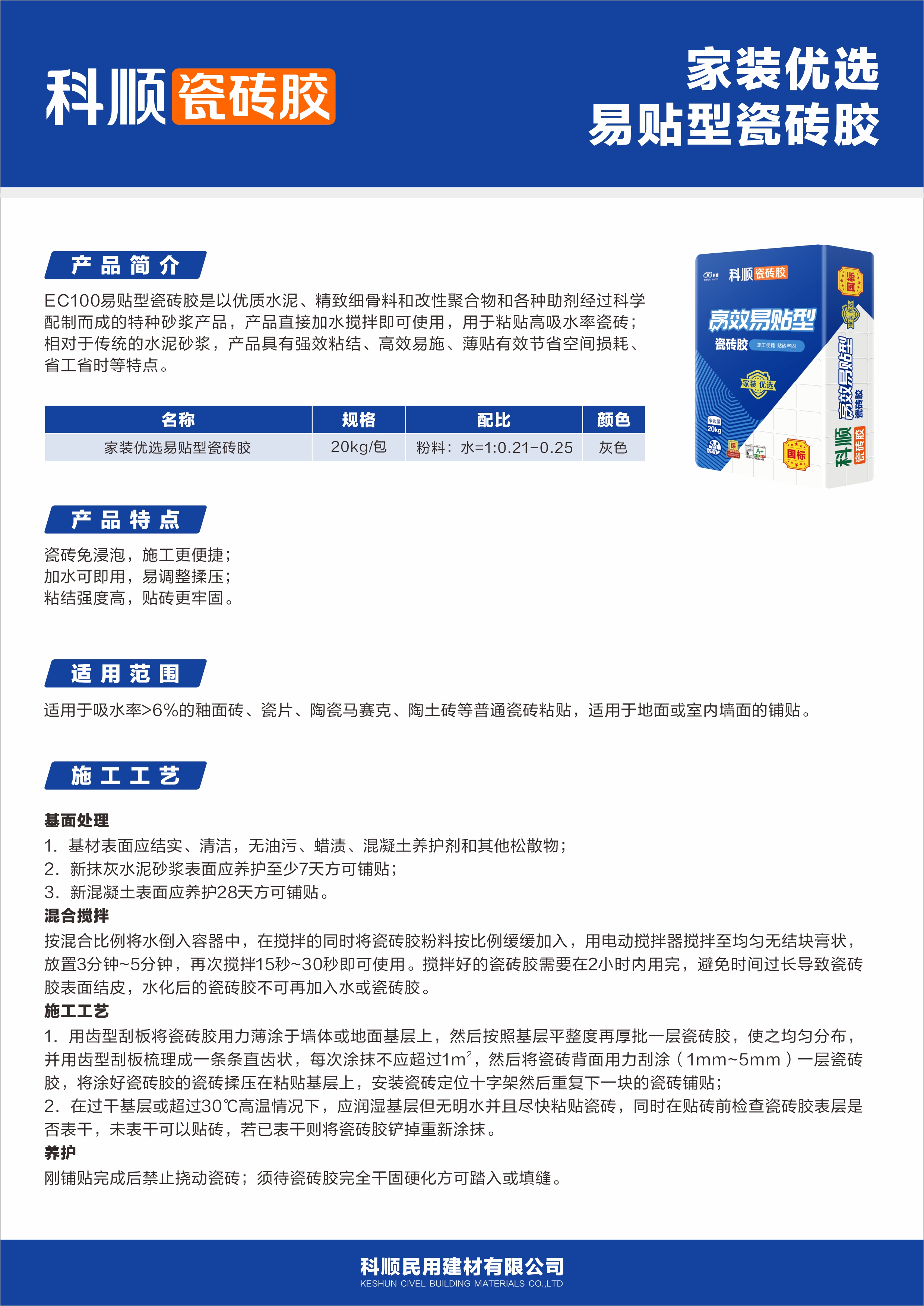 EC100易贴型瓷砖胶是以优质水泥、精致细骨料和改性聚合物和各种助剂经过科学配制而成的特种砂浆产品,产品直接加水搅拌即可使用,用于粘贴高吸水率瓷砖;相对于传统的水泥砂浆,产品具有强效粘结、高效易施、薄贴有效节省空间损耗、省工省时等特点。