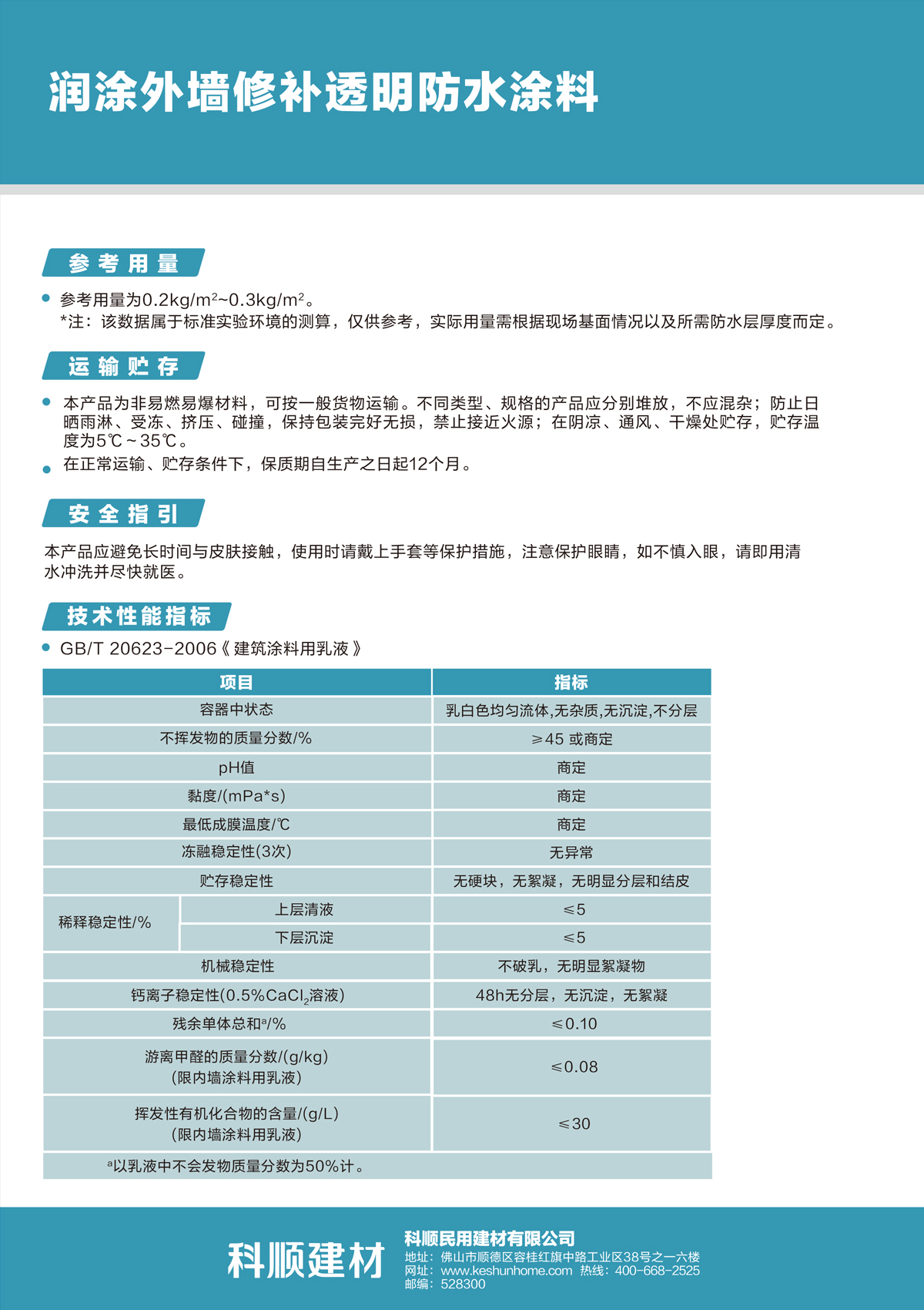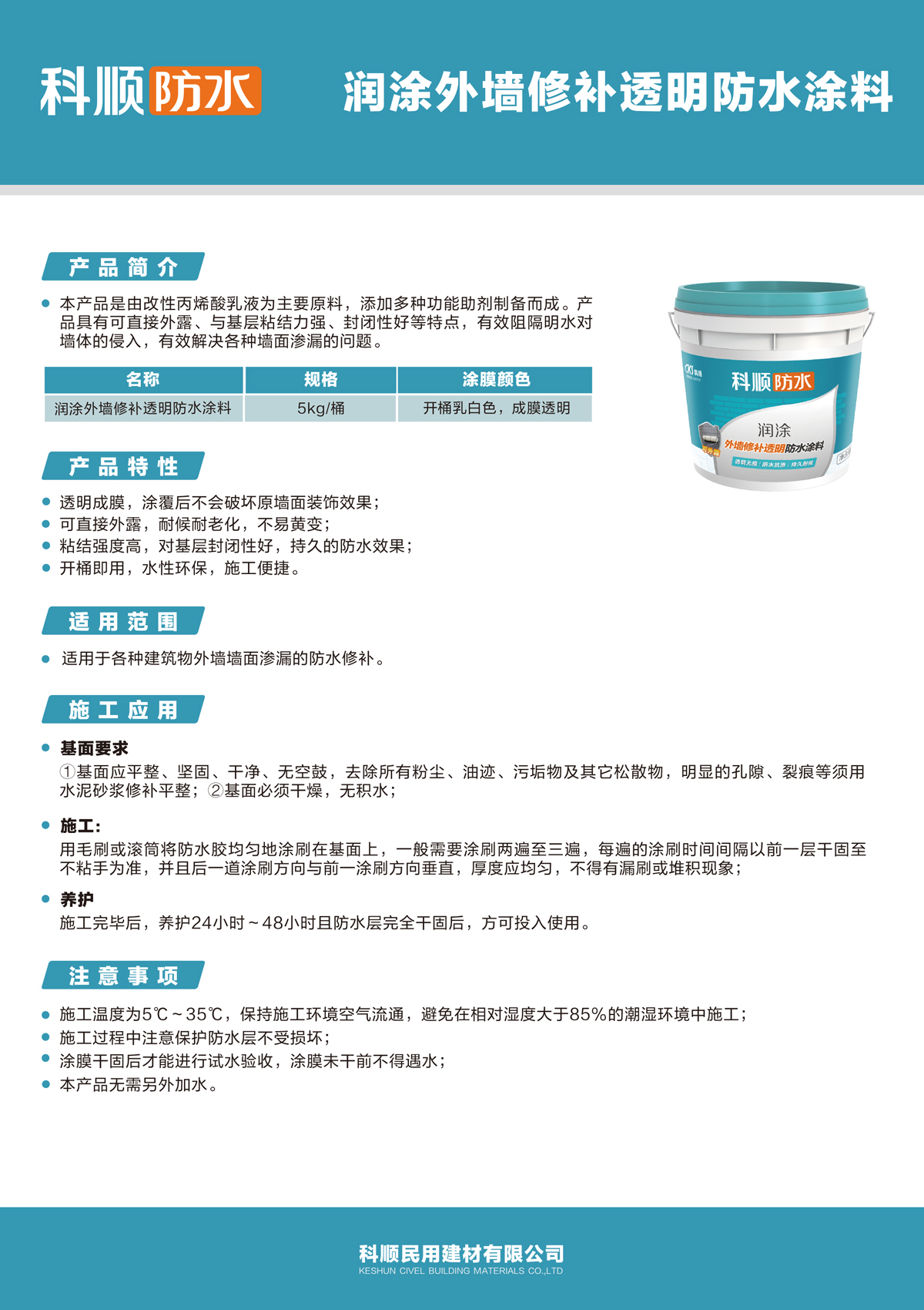 本产品是由改性丙烯酸乳液为主要原料,添加多种功能助剂制备而成。产品具有可直接外露、与基层粘结力强、封闭性好等特点,有效阻隔明水对墙体的侵入,有效解决各种墙面渗漏的问题。