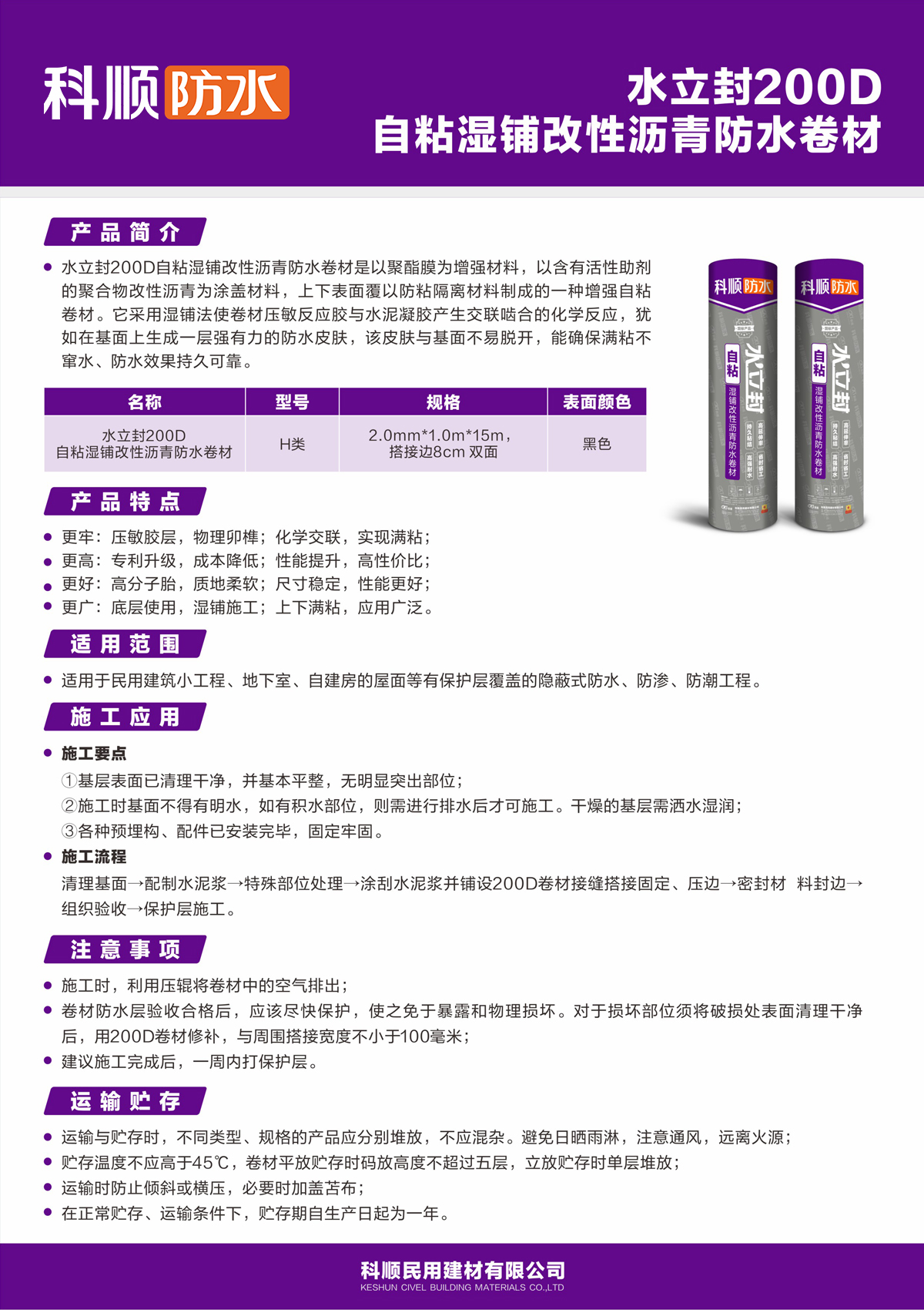 水立封200D自粘湿铺改性沥青防水卷材是以聚酯膜为增强材料,以含有活性助剂的聚合物改性沥青为涂盖材料,上下表面覆以防粘隔离材料制成的一种增强自粘卷材。它采用湿铺法使卷材压敏反应胶与水泥凝胶产生交联啮合的化学反应,犹如在基面上生成一层强有力的防水皮肤,该皮肤与基面不易脱开,能确保满粘不窜水、防水效果持久可靠。